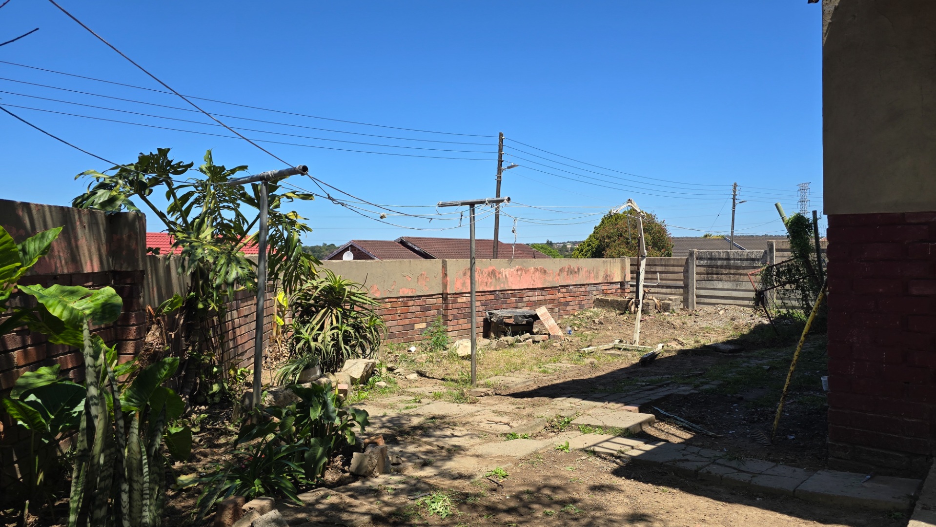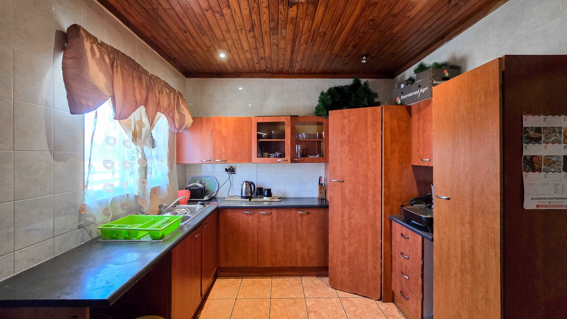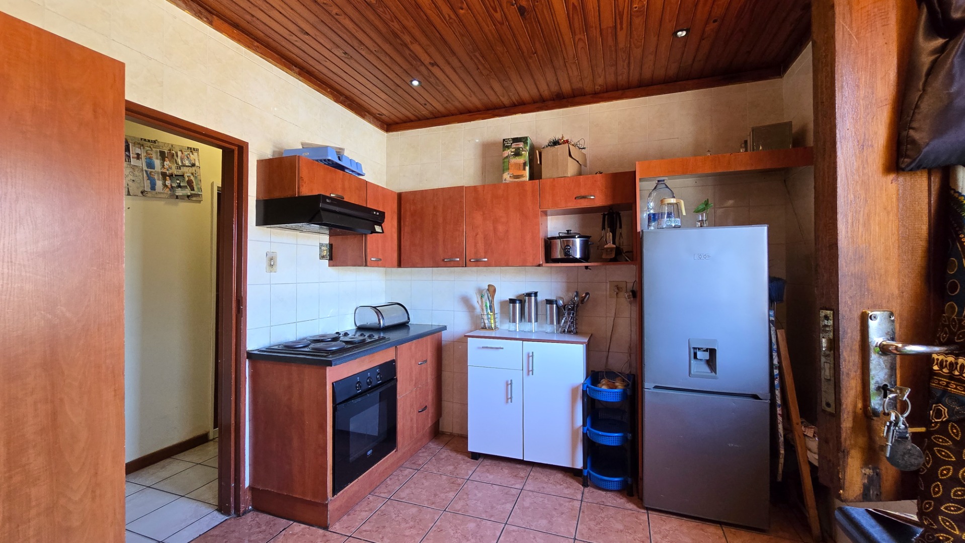 The home features a welcoming lounge and dining area with a beautiful wooden ceiling and exposed brick walls, creating a cozy and homely feel. The kitchen is fitted with built-in cupboards and ample counter space, ideal for preparing family meals.