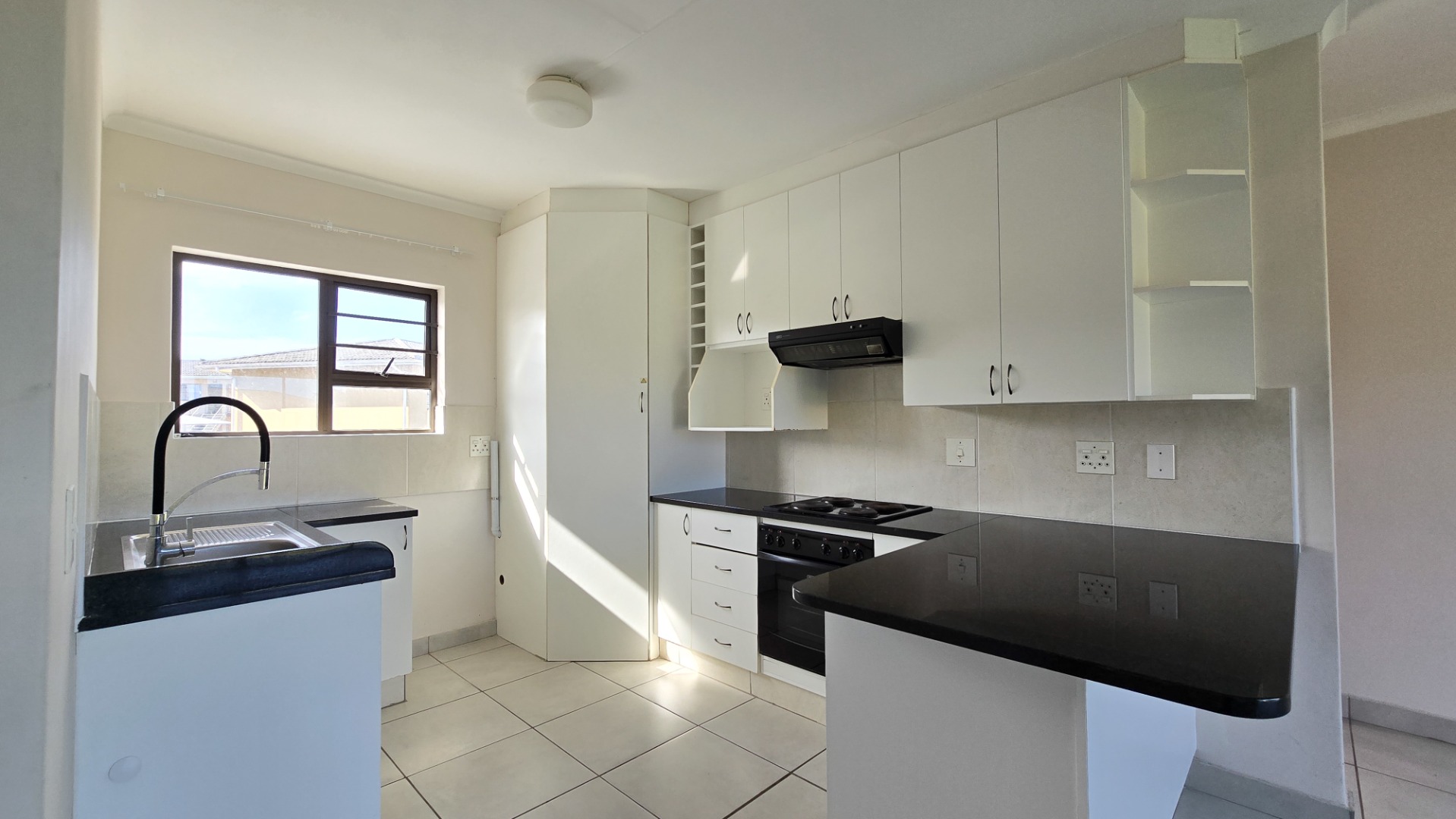 The apartment offers two bedrooms, both fitted with built-in cupboards, and a full bathroom featuring a bath and shower. The open-plan kitchen and lounge create a warm, inviting flow, with the kitchen boasting granite countertops, an under-counter electric oven, and hob. The lounge extends through a glass sliding door onto a private balcony — ideal for relaxing or enjoying your morning coffee.