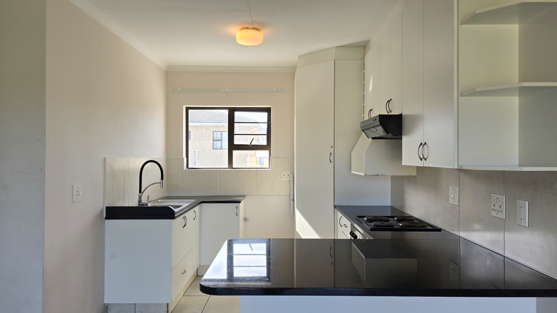 The apartment offers two bedrooms, both fitted with built-in cupboards, and a full bathroom featuring a bath and shower. The open-plan kitchen and lounge create a warm, inviting flow, with the kitchen boasting granite countertops, an under-counter electric oven, and hob. The lounge extends through a glass sliding door onto a private balcony — ideal for relaxing or enjoying your morning coffee.