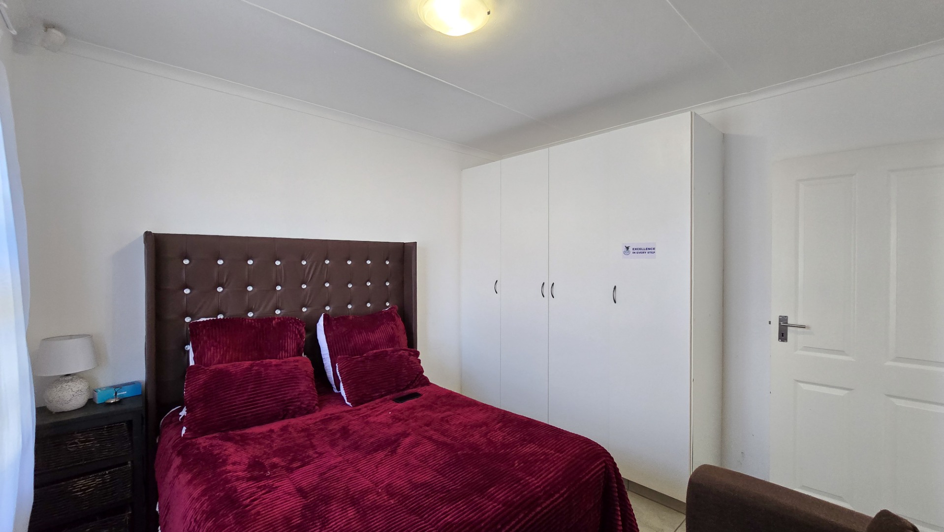 Both bedrooms offer built-in cupboards, providing ample storage for clothing and personal belongings. The tiled flooring throughout not only adds to the sleek, contemporary aesthetic but also ensures easy maintenance.
