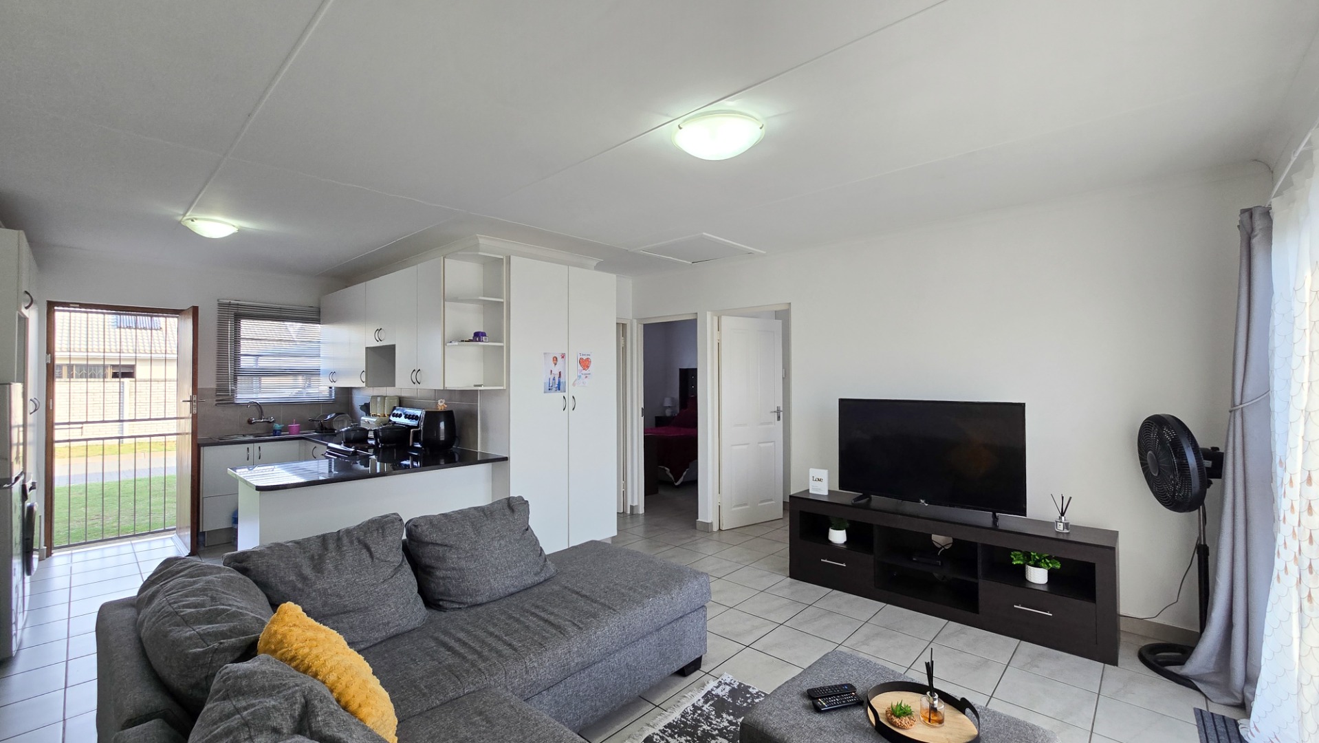 The open-plan lounge and kitchen enhance the sense of space and flow. The kitchen is fitted with built-in cupboards and ample countertop space.