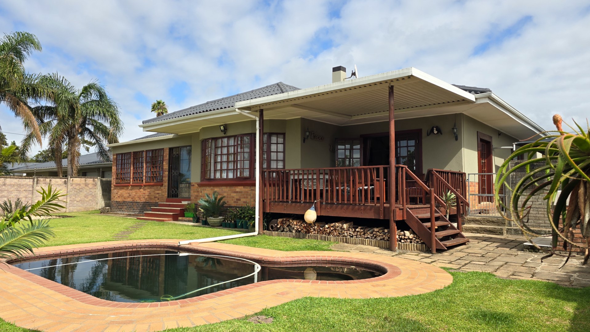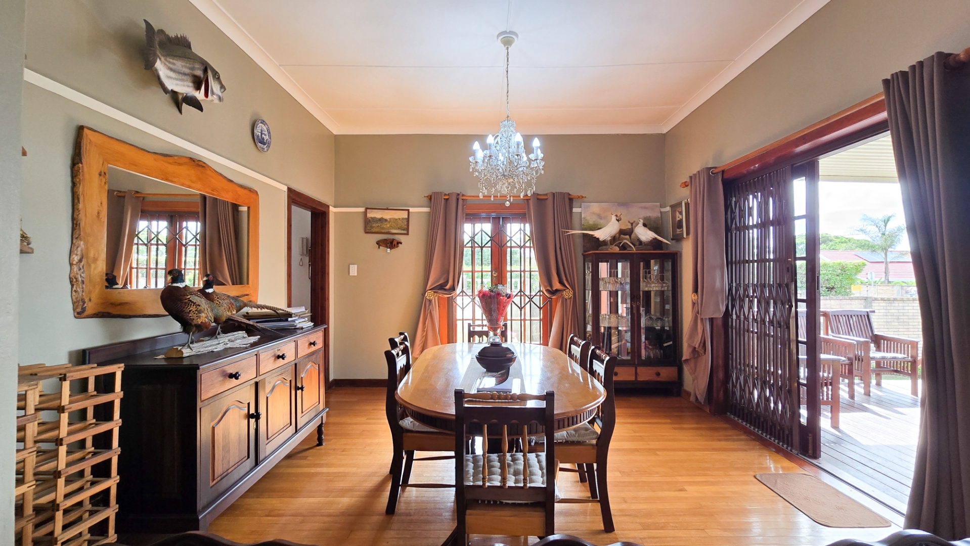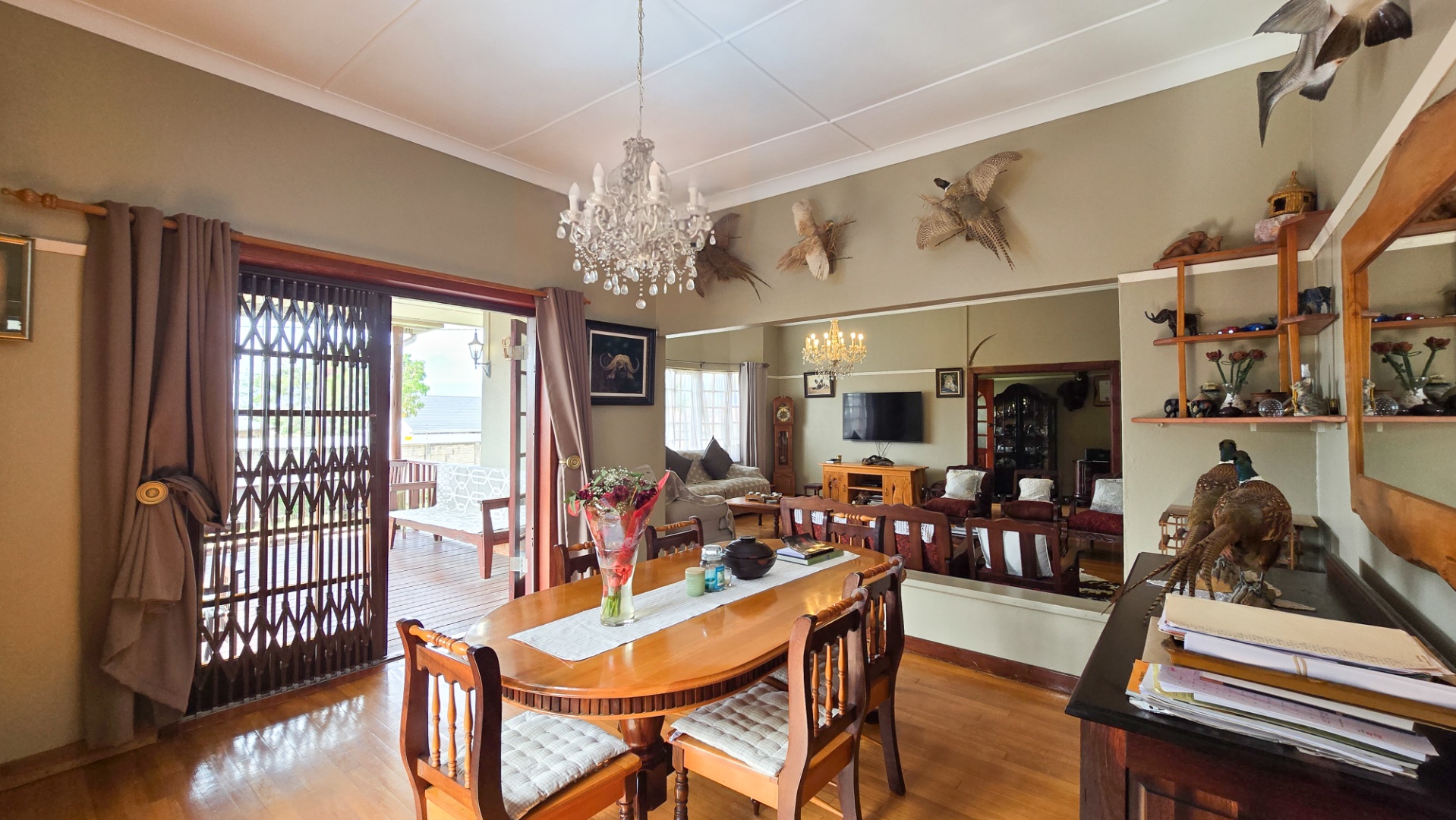 The dining area flows effortlessly onto a covered wooden deck, ideal for relaxed entertaining, and leads to an inviting outdoor braai area and sparkling swimming pool.