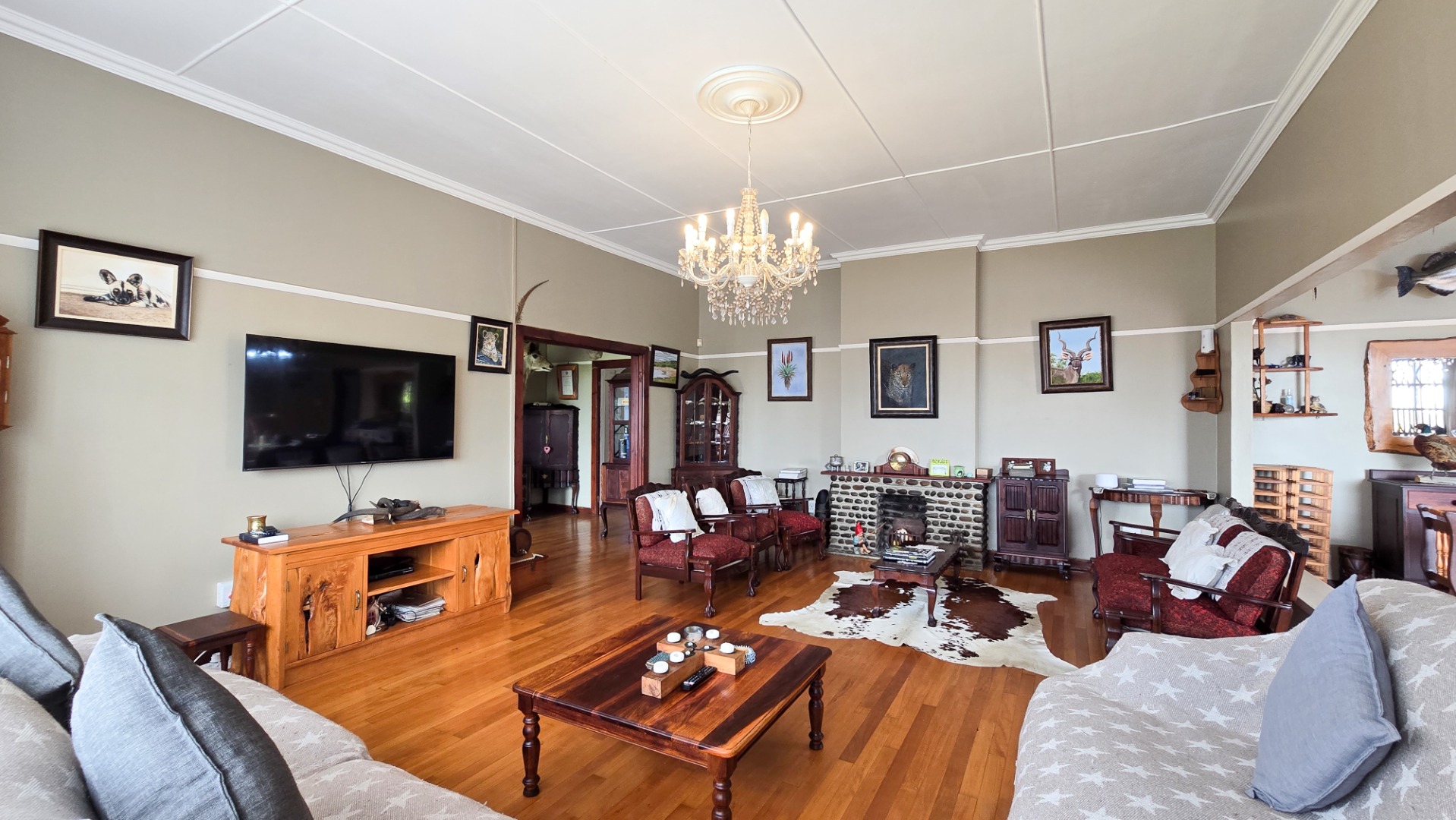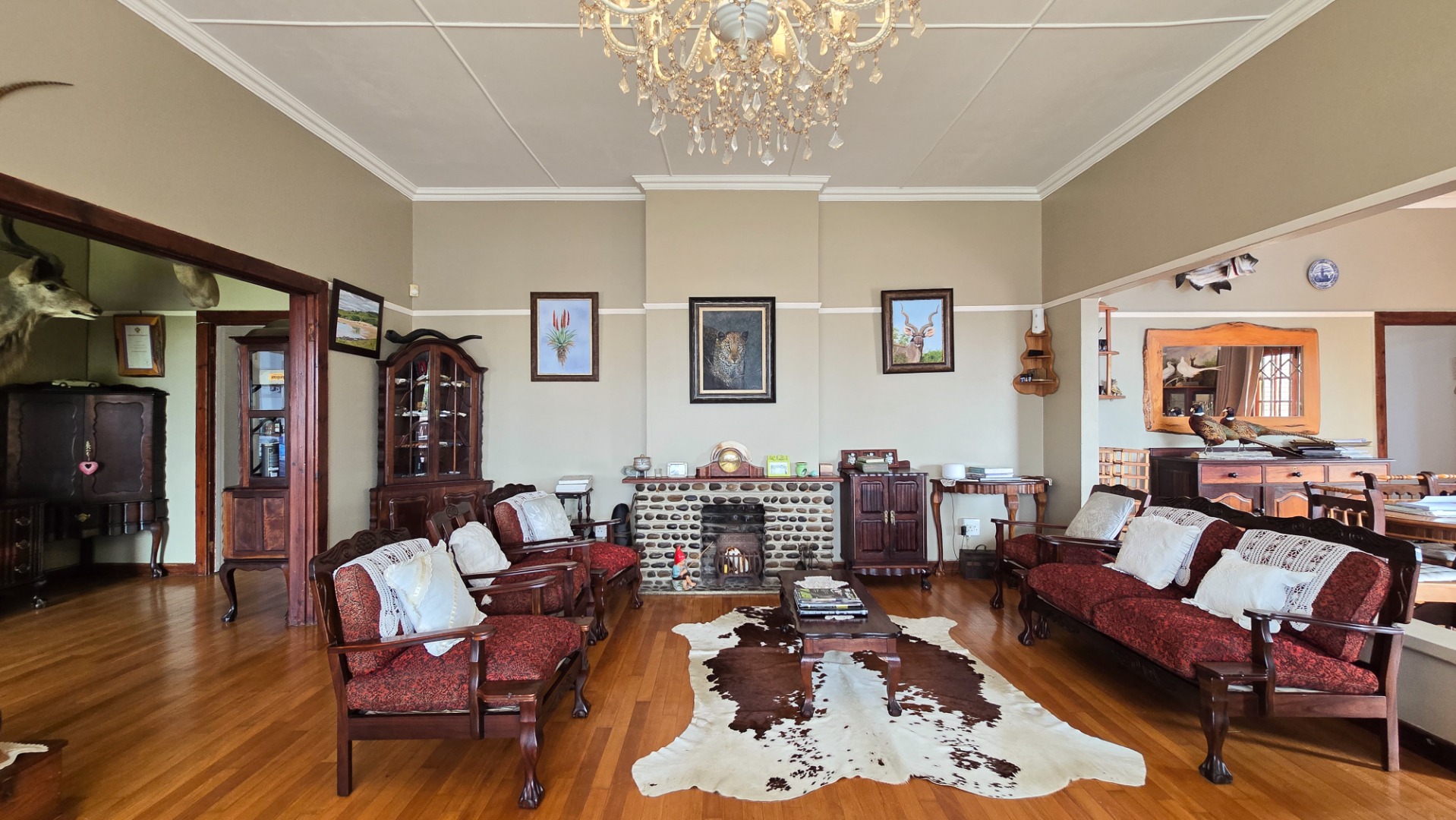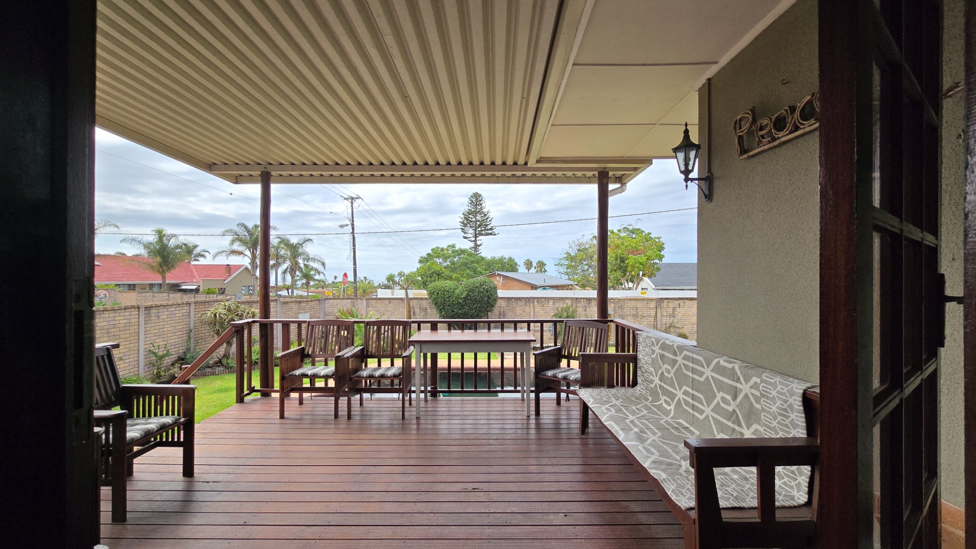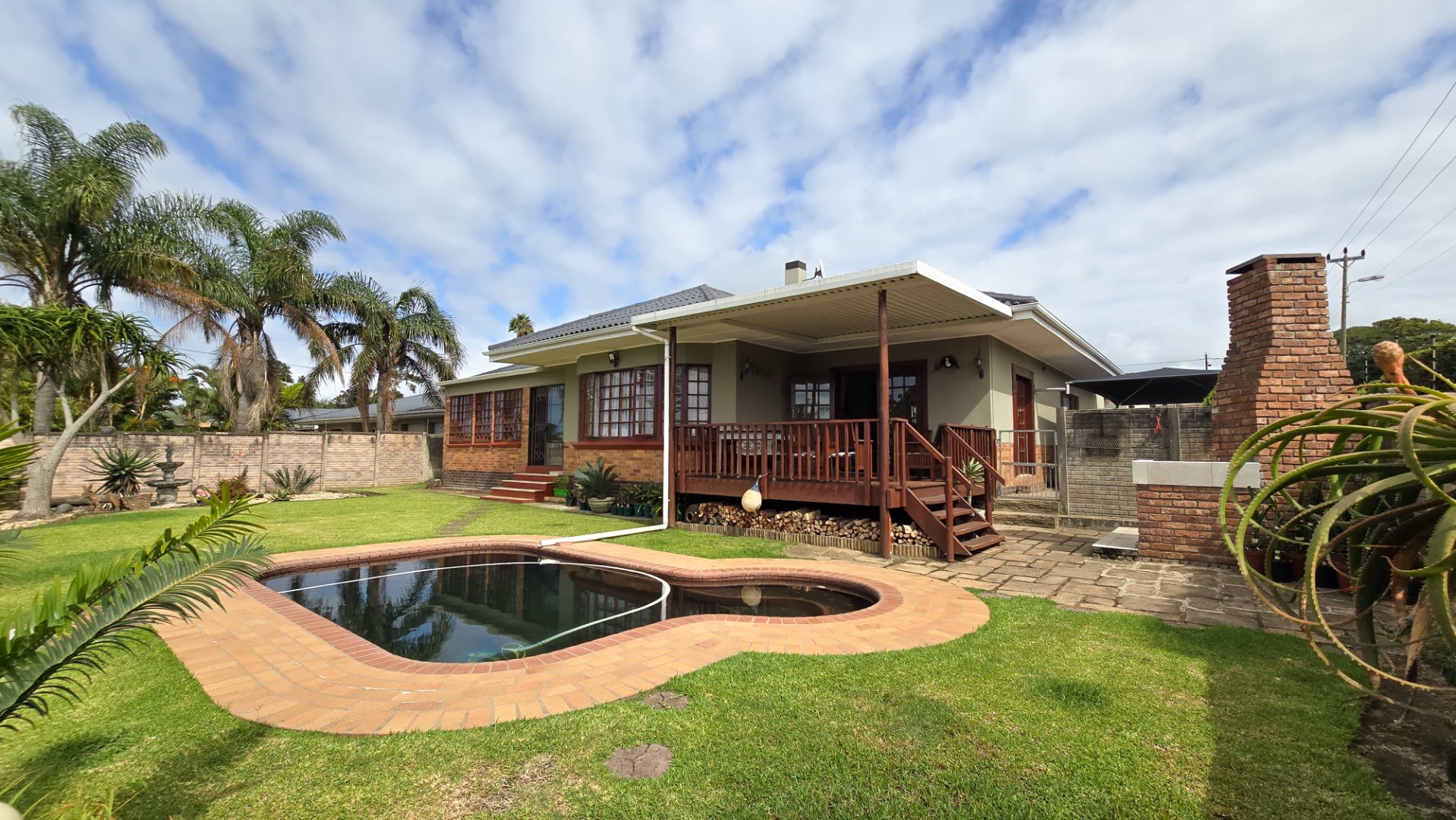 The dining area flows effortlessly onto a covered wooden deck, ideal for relaxed entertaining, and leads to an inviting outdoor braai area and sparkling swimming pool.