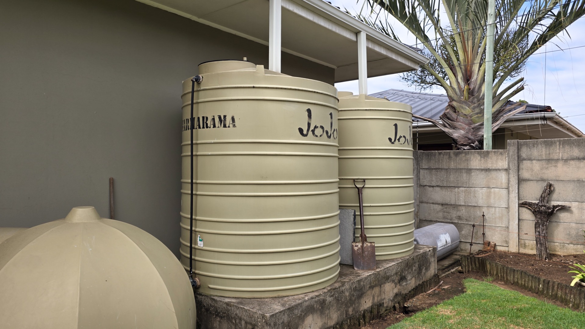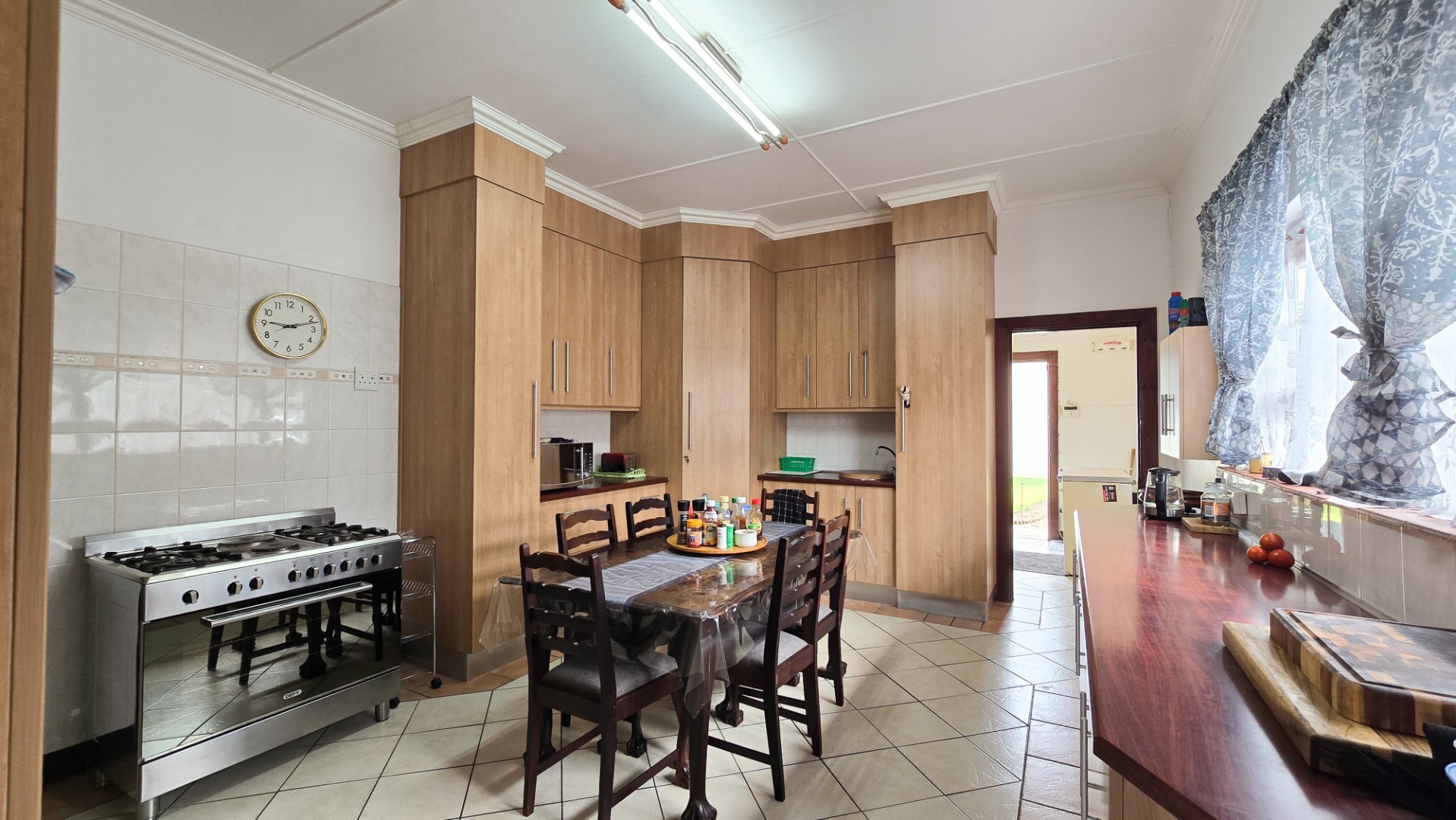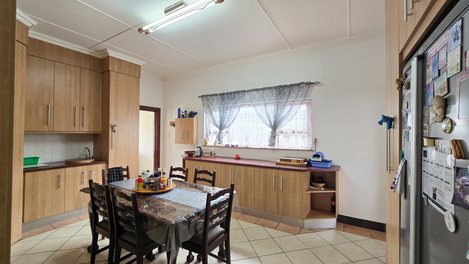The separate kitchen is well designed and functional, featuring ample cupboard space, postform countertops, and a gas point for a freestanding gas stove. A dedicated scullery offers space for a top-loader washing machine, dryer, and dishwasher connections, keeping the main kitchen neat and uncluttered.