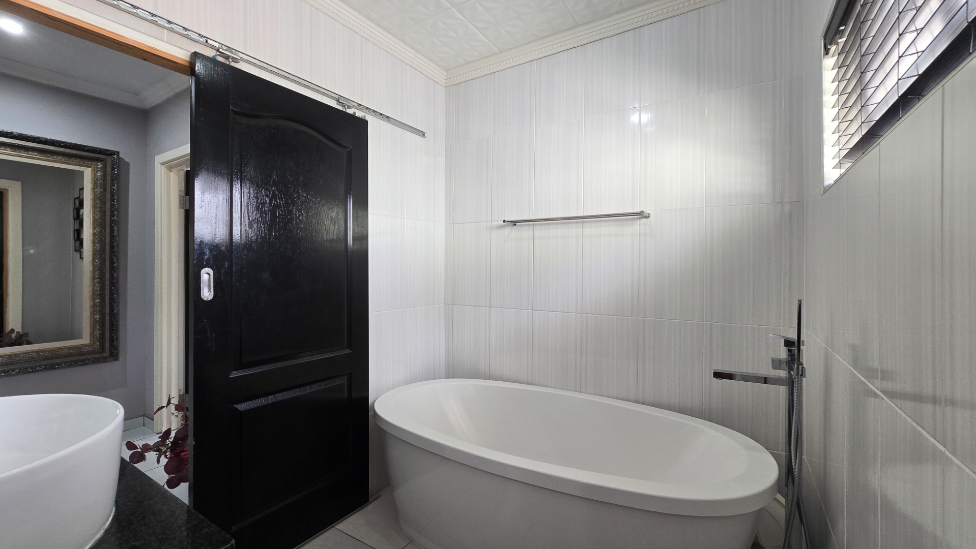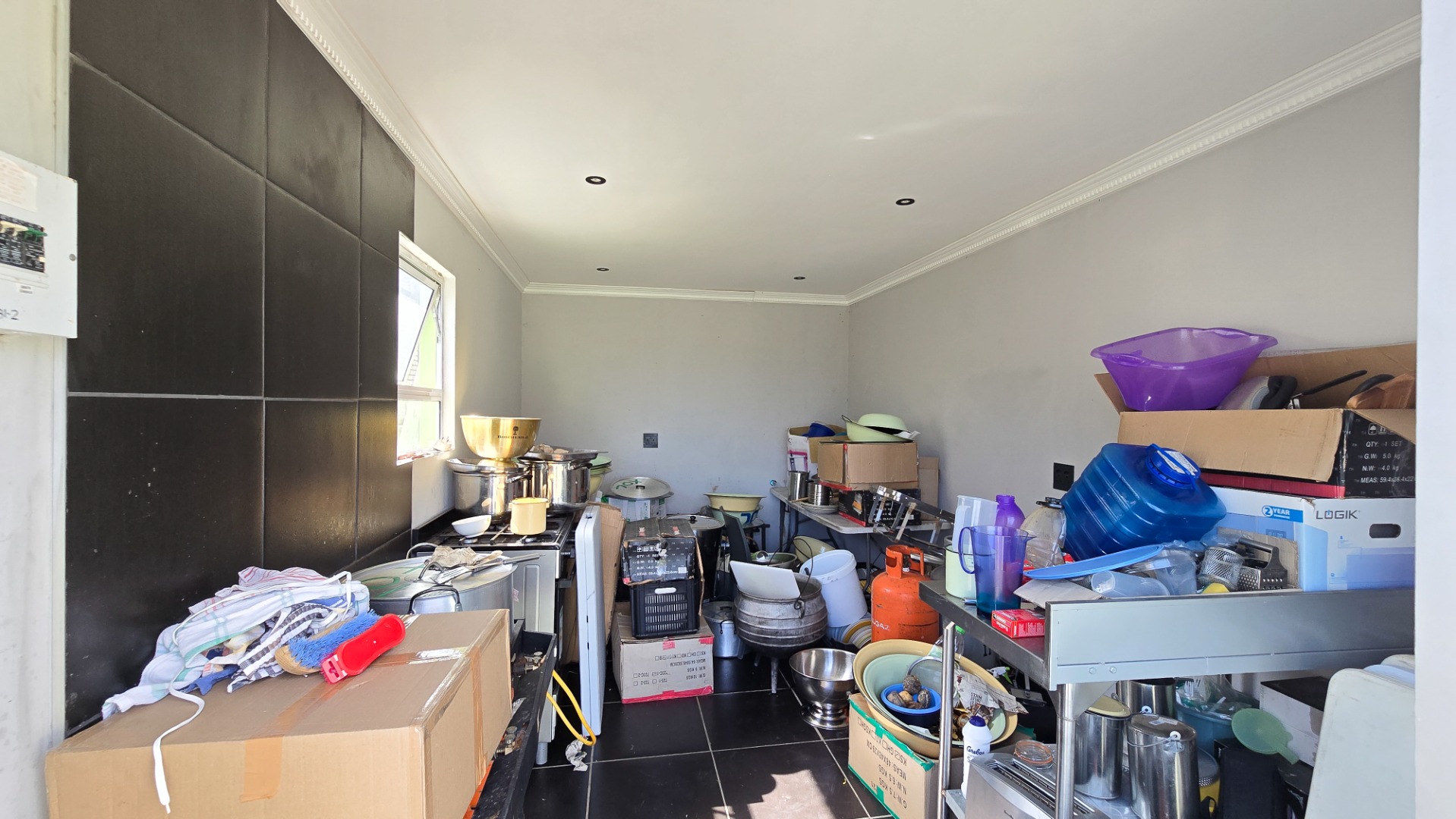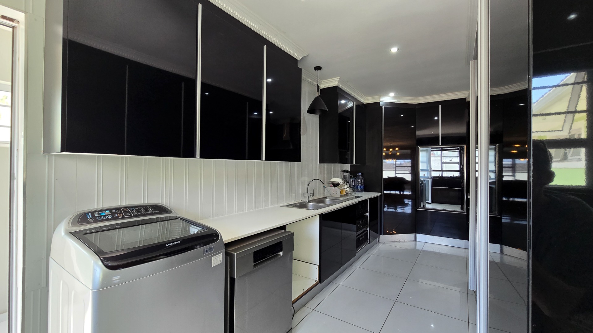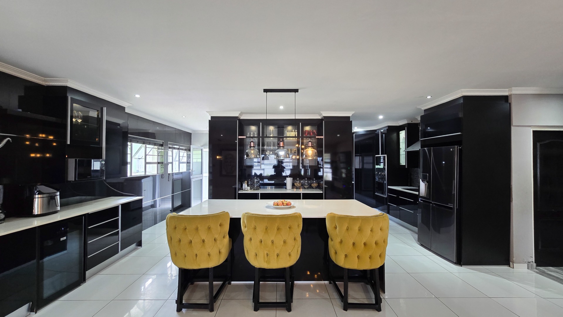 The large, tiled kitchen is a chef’s delight, featuring a breakfast nook, under-counter oven, hob, extractor fan, and ample built-in cupboards and drawer space. A separate scullery and laundry add to the home’s practicality.