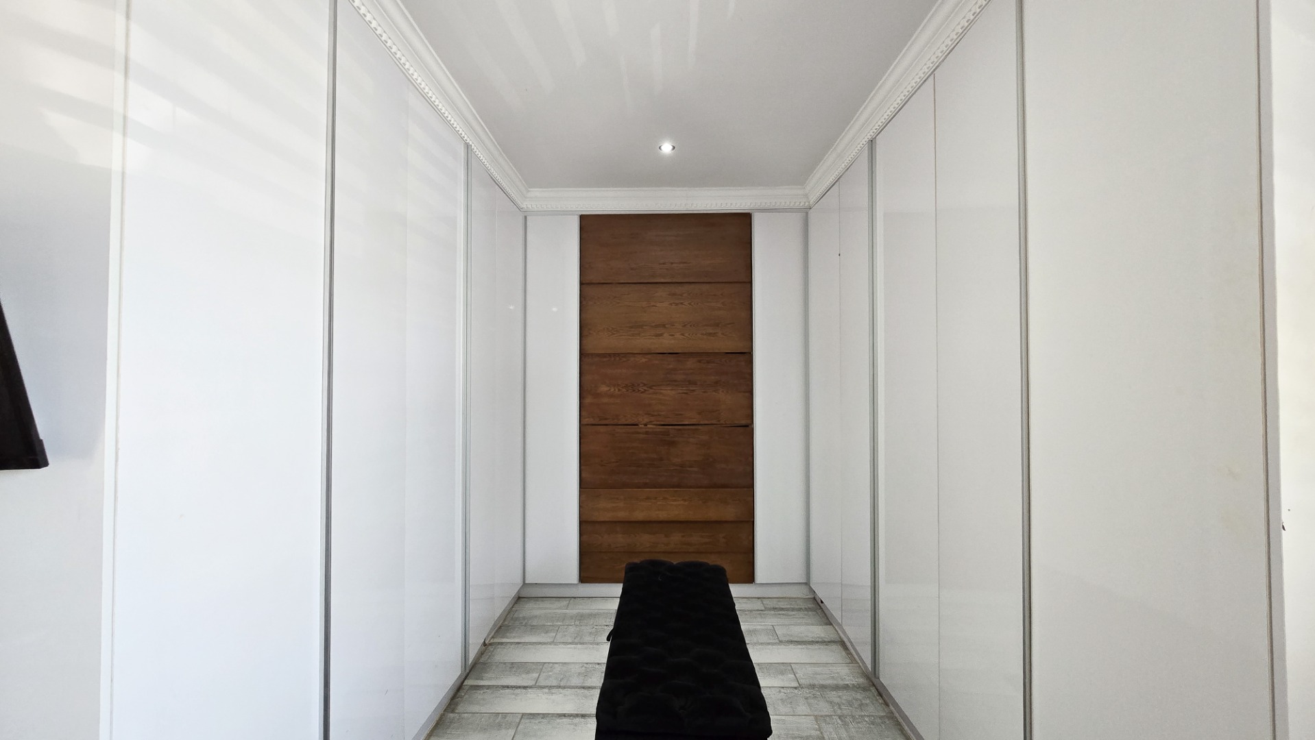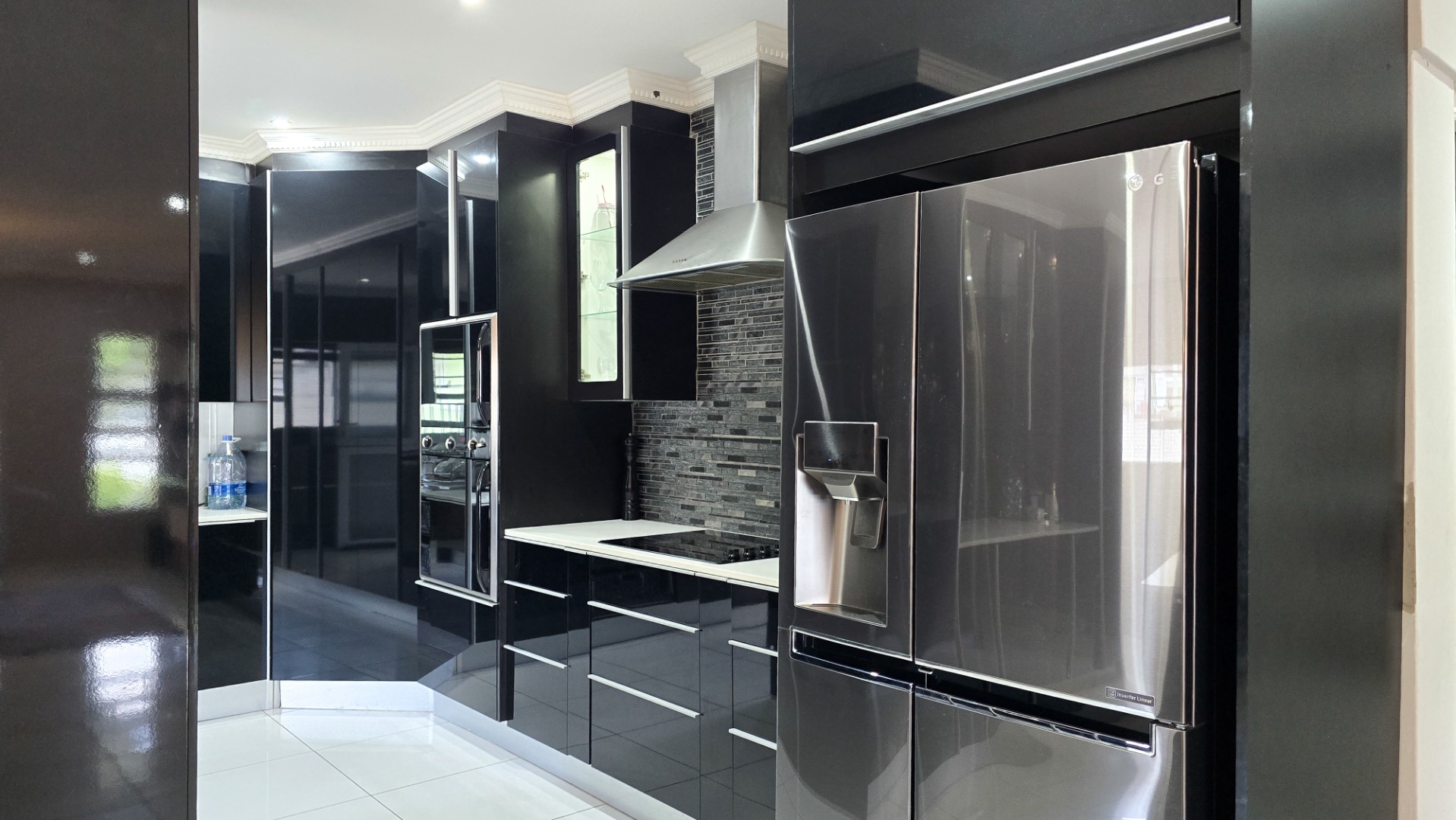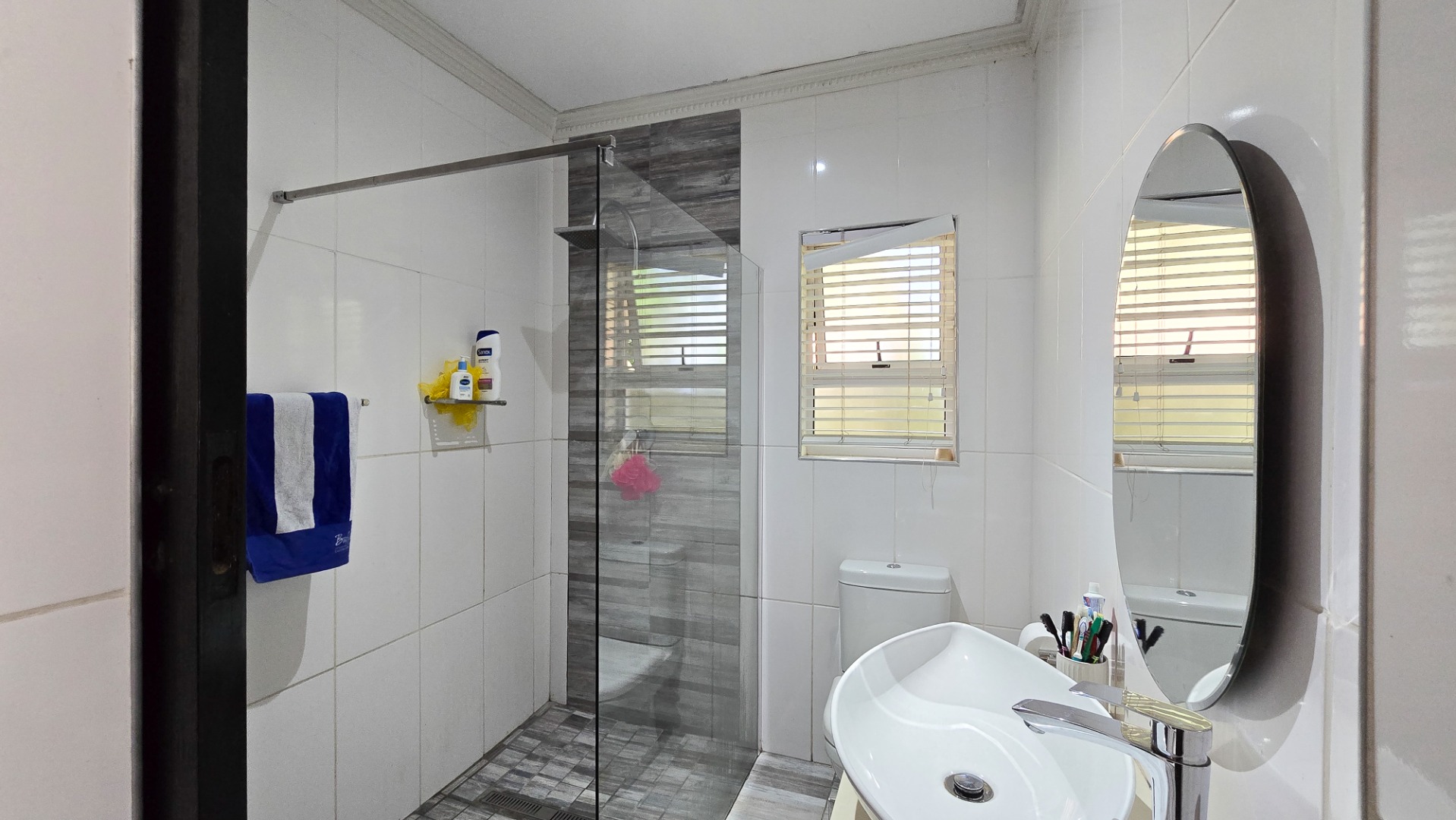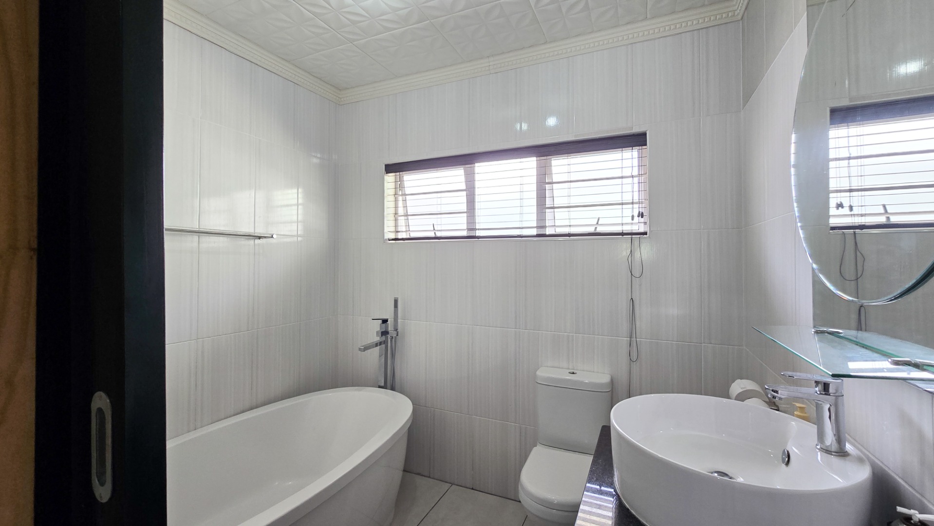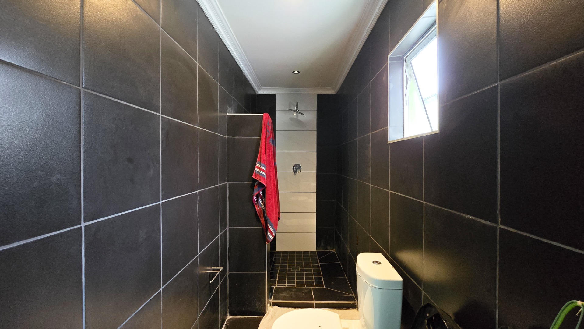 The large, tiled kitchen is a chef’s delight, featuring a breakfast nook, under-counter oven, hob, extractor fan, and ample built-in cupboards and drawer space. A separate scullery and laundry add to the home’s practicality.
