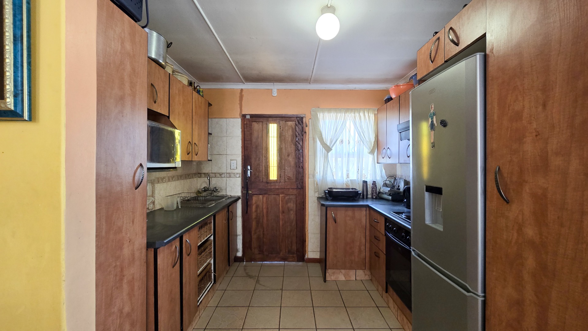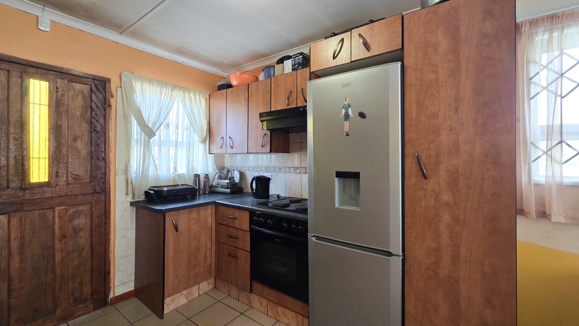 Inside, the home spans 135 sqm, featuring an open-plan layout that seamlessly connects the living spaces. The bright interior boasts tiled flooring throughout, ensuring durability and easy maintenance. The lounge and dining room are bathed in natural light from multiple windows, creating an inviting atmosphere. The functional kitchen is equipped with ample wooden cabinetry, a built-in oven and hob, an extractor fan, and space for a large refrigerator, catering to everyday culinary needs.