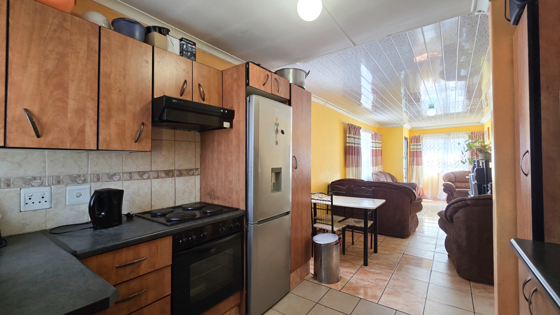 Inside, the home spans 135 sqm, featuring an open-plan layout that seamlessly connects the living spaces. The bright interior boasts tiled flooring throughout, ensuring durability and easy maintenance. The lounge and dining room are bathed in natural light from multiple windows, creating an inviting atmosphere. The functional kitchen is equipped with ample wooden cabinetry, a built-in oven and hob, an extractor fan, and space for a large refrigerator, catering to everyday culinary needs.