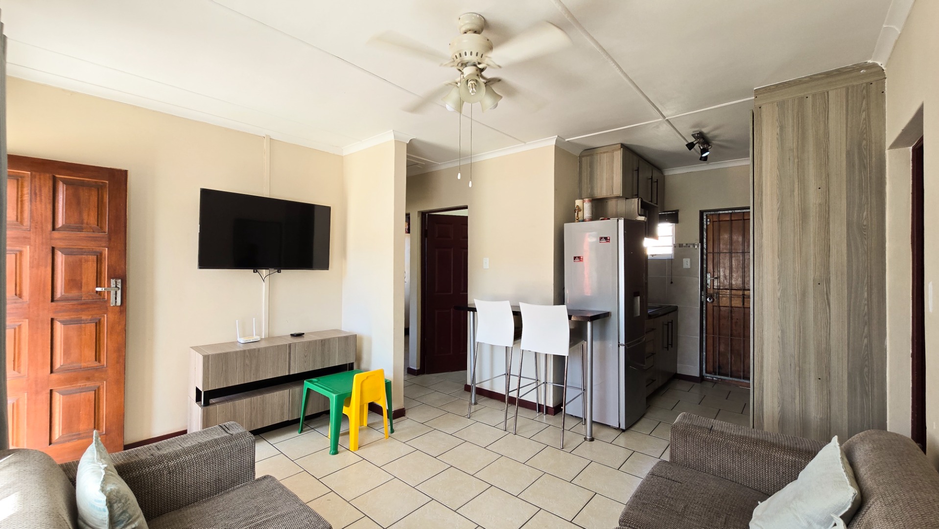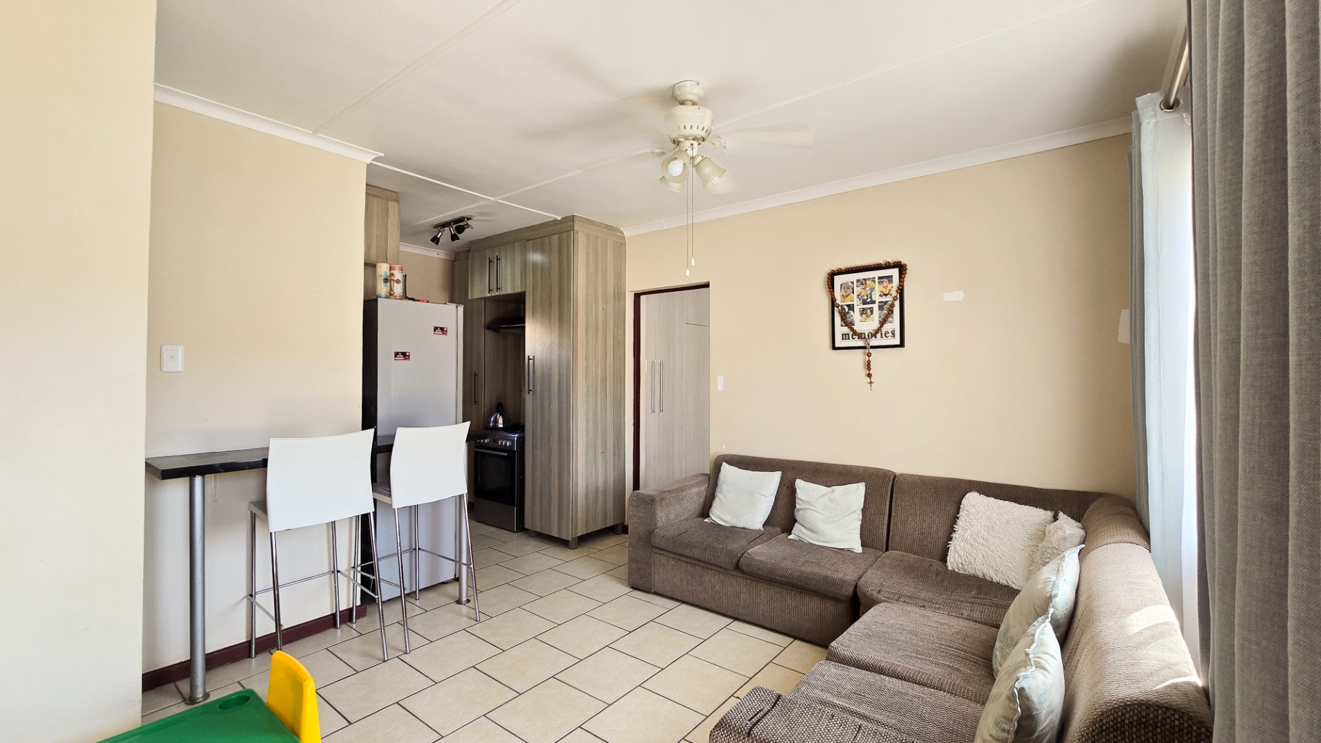 The kitchen includes built-in cupboards and a breakfast nook, flowing seamlessly into an open-plan lounge, ideal for comfortable family living. The property also offers a spacious backyard, open parking space, and is fully walled for added privacy and security.