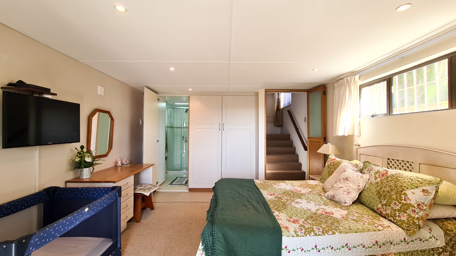 The lower-level residence features a spacious lounge with a cosy fireplace, a dining area, and a study—each graced with elegant parquet flooring. A sunny enclosed veranda opens onto a tranquil patio and braai area, all seamlessly connected to the lush garden and sparkling pool.