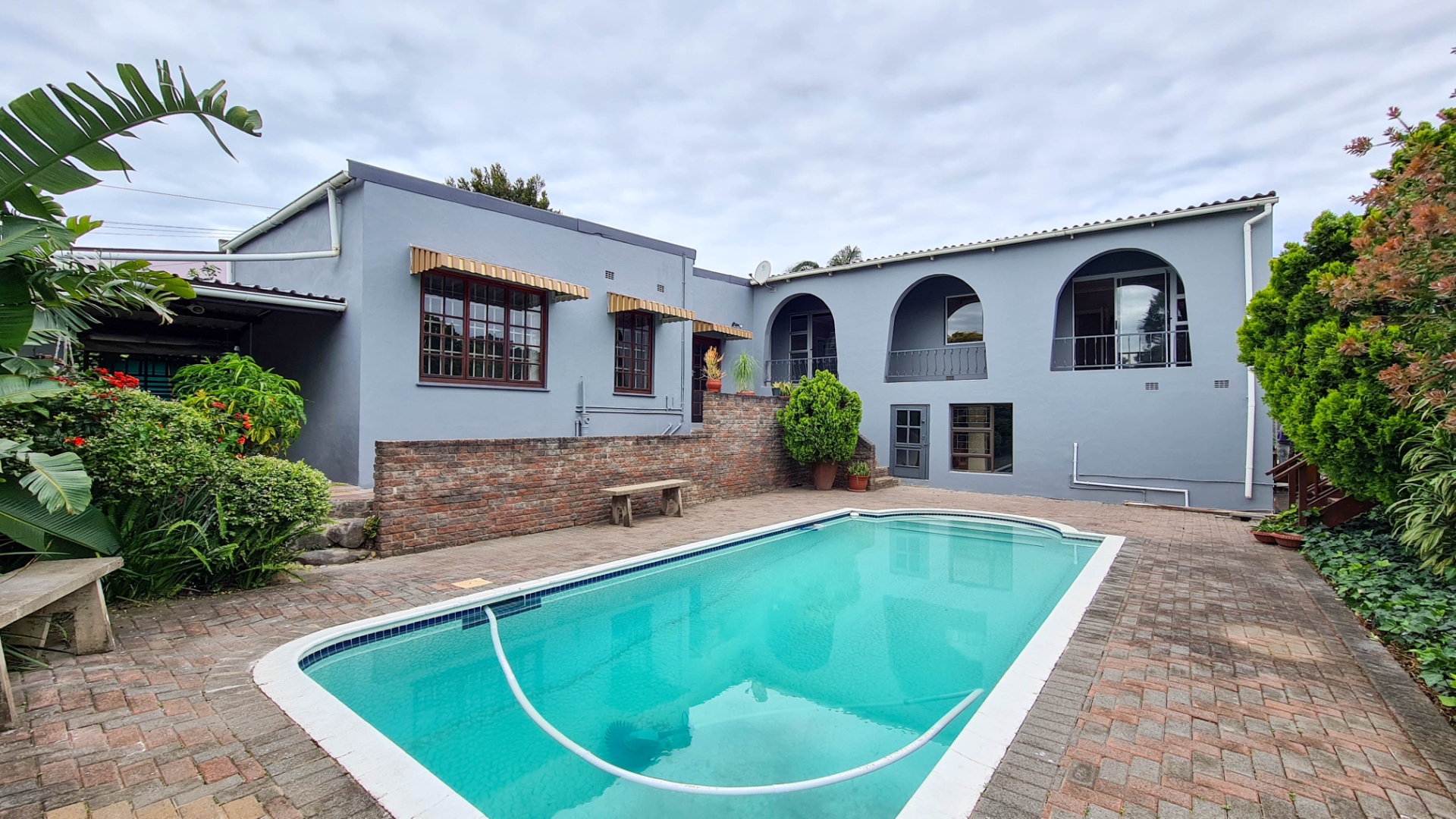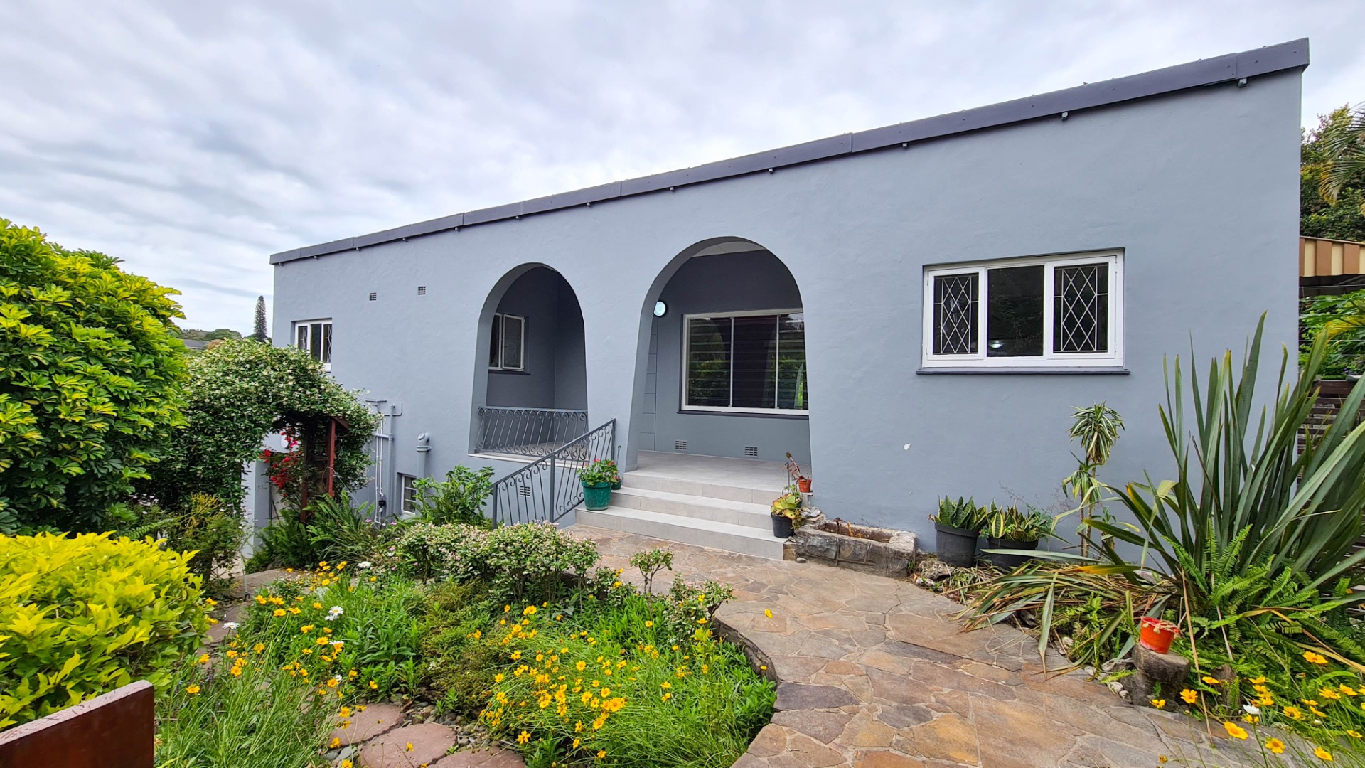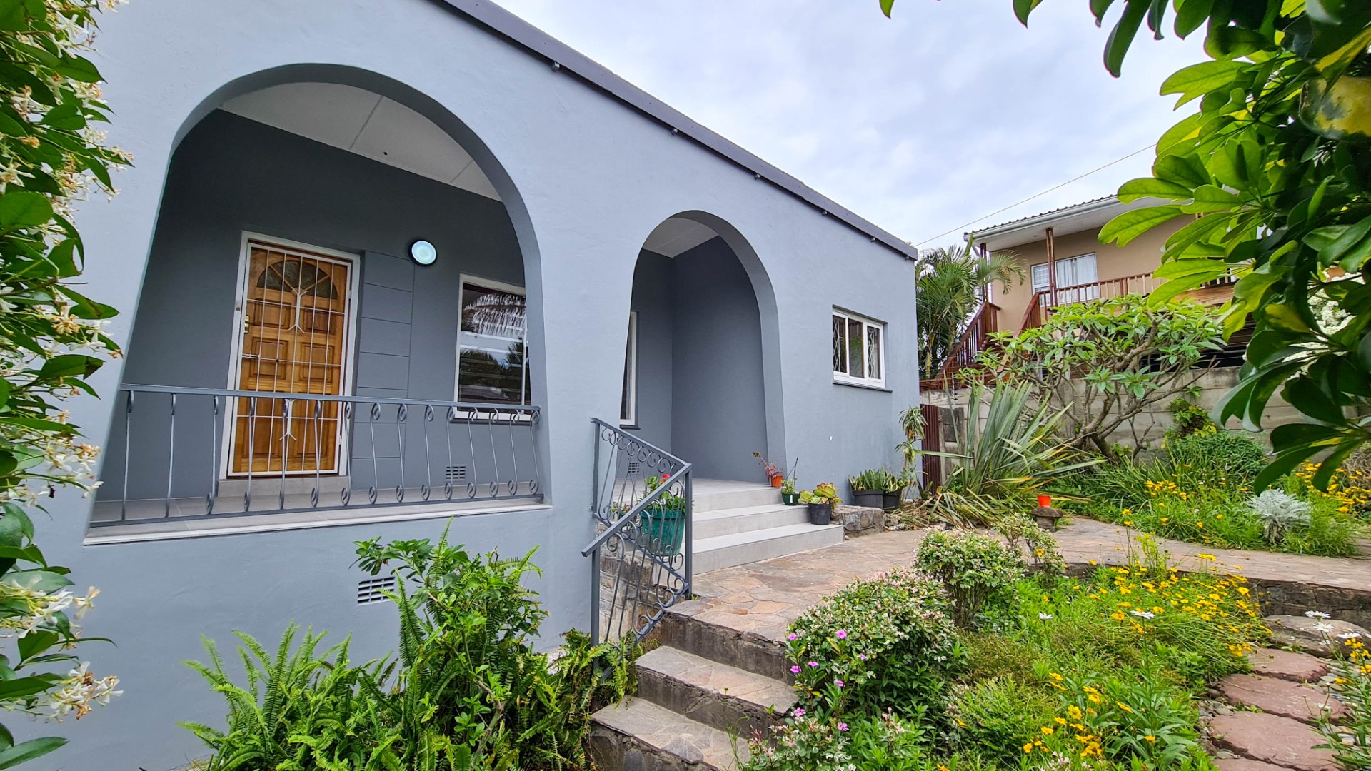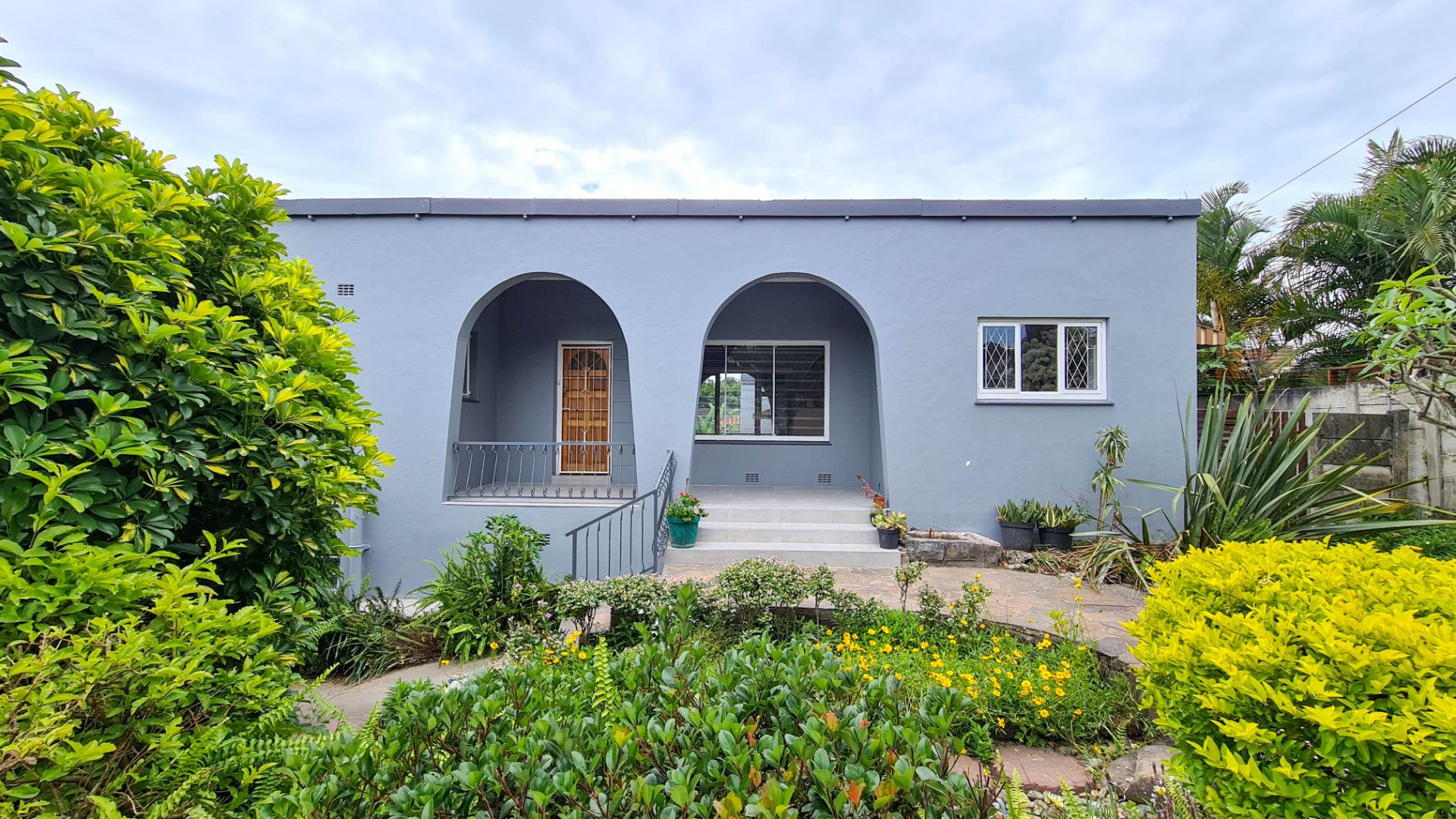 Discover this charming 4-bedroom, 2-bathroom residence nestled in the suburban heart of Nahoon Valley, East London. The property immediately impresses with its distinctive architectural arches and a freshly painted light blue/grey exterior, creating a welcoming first impression. A lush, well-maintained garden, adorned with diverse plants and vibrant flowers, frames the home, leading to a charming covered entrance with a tiled patio and elegant steps.