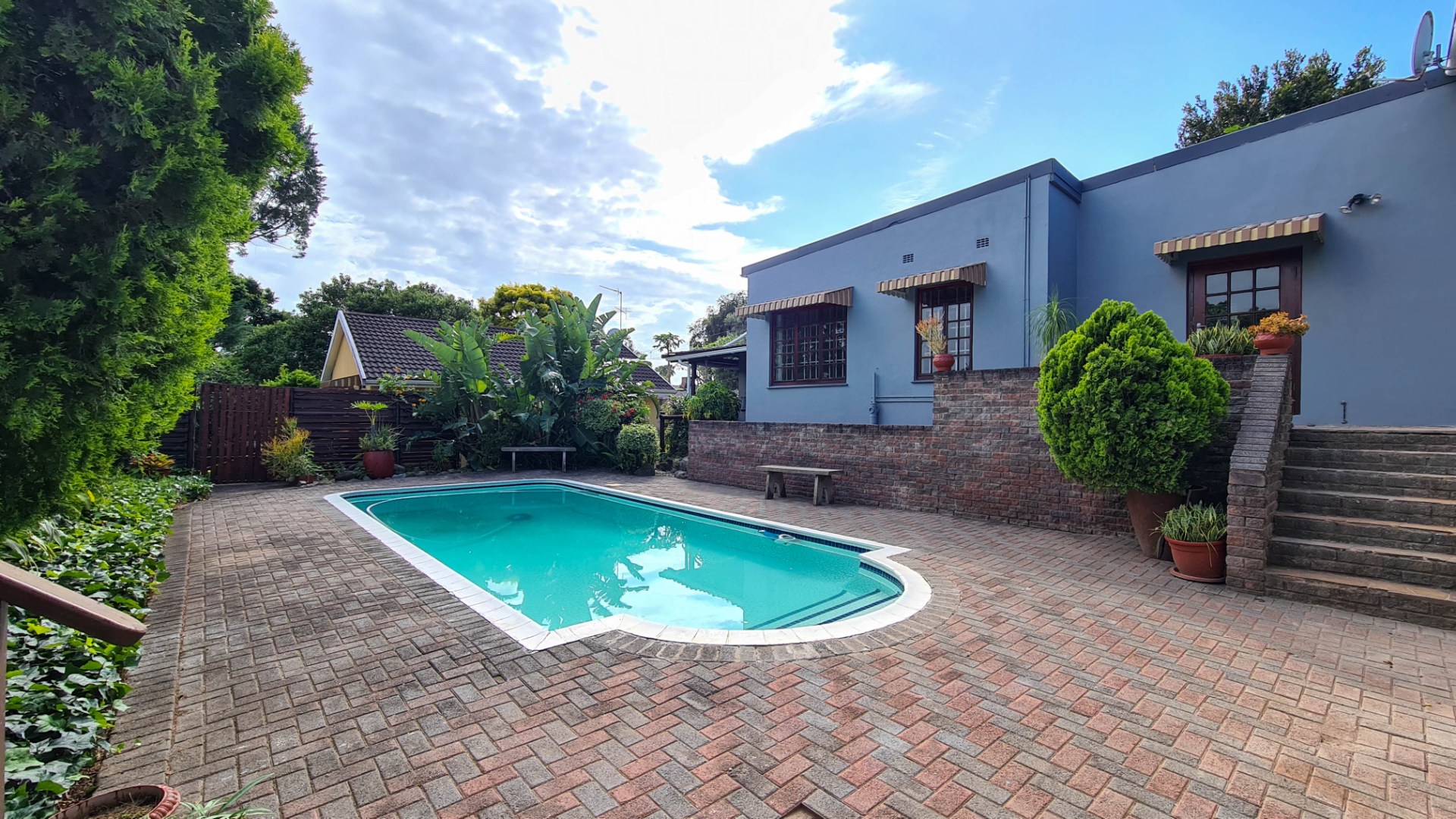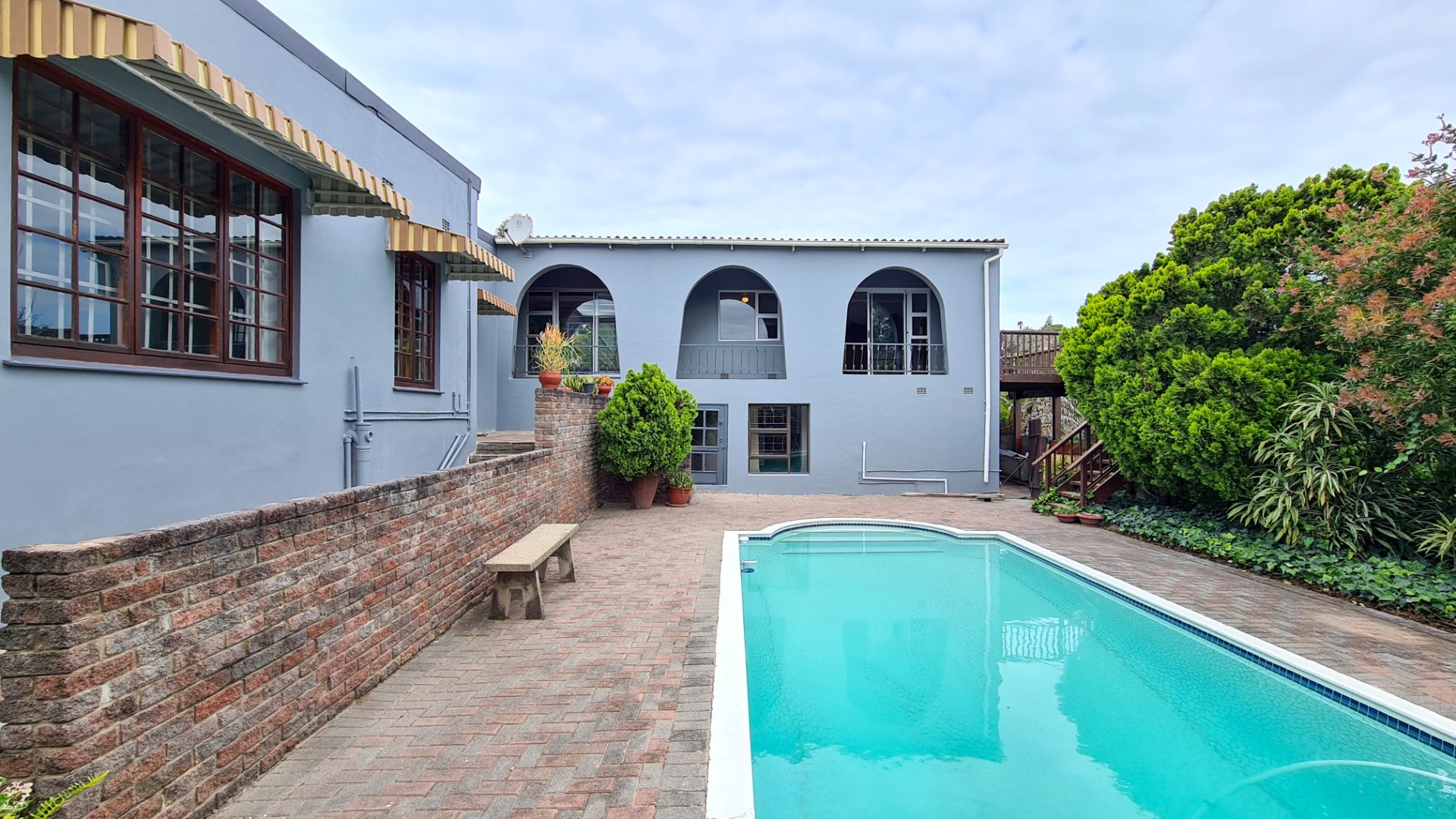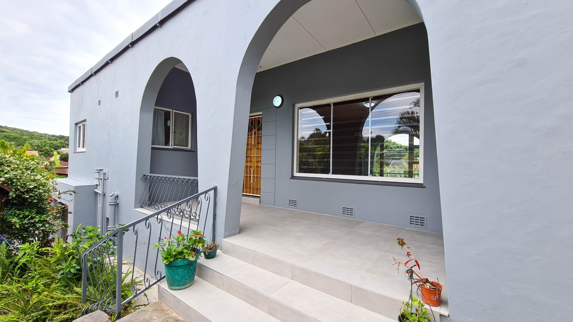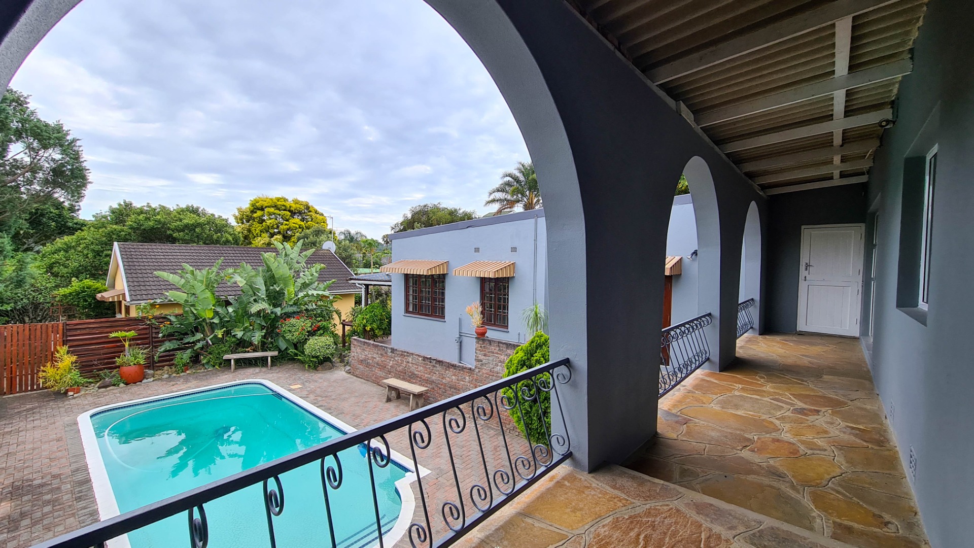 Discover this charming 4-bedroom, 2-bathroom residence nestled in the suburban heart of Nahoon Valley, East London. The property immediately impresses with its distinctive architectural arches and a freshly painted light blue/grey exterior, creating a welcoming first impression. A lush, well-maintained garden, adorned with diverse plants and vibrant flowers, frames the home, leading to a charming covered entrance with a tiled patio and elegant steps.