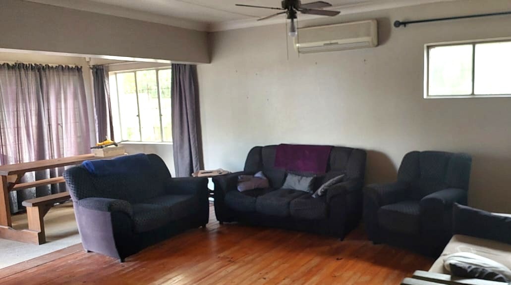 The interior boasts an open-plan layout, enhancing the flow between living areas. The spacious lounge is fitted with hardwood flooring, large windows for natural light, a ceiling fan, and an air conditioning unit for year-round comfort. A dedicated dining room provides a perfect setting for meals.