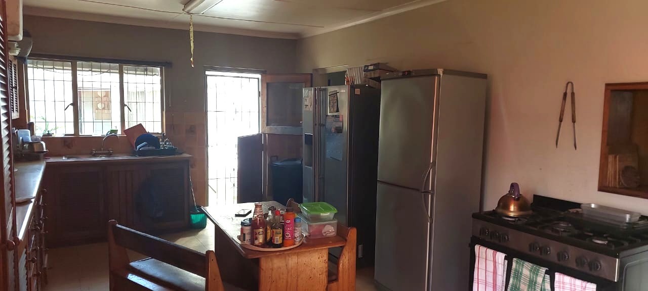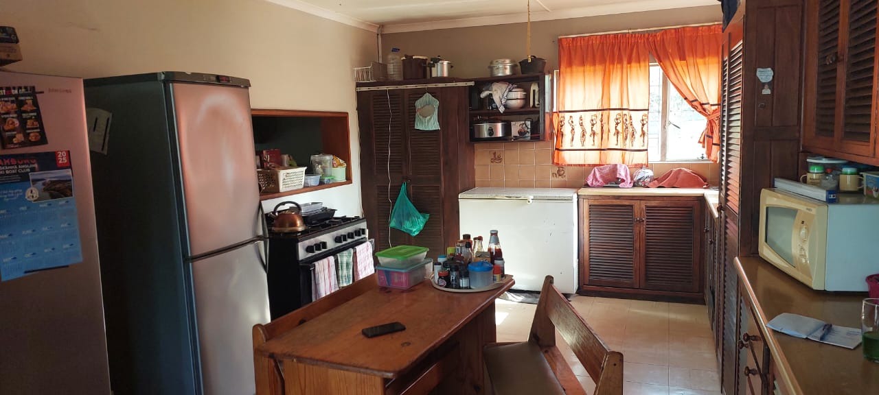 The functional kitchen is equipped with dark wooden louvered cabinets, a central island ideal for dining or prep, and generous space to accommodate multiple large appliances, including two refrigerators, a chest freezer, and a stove. The property offers three well-proportioned bedrooms and a single bathroom.
