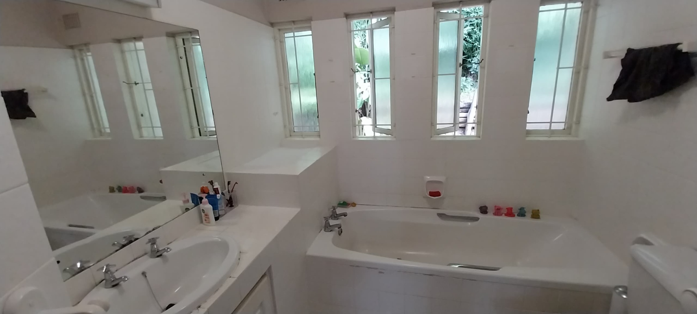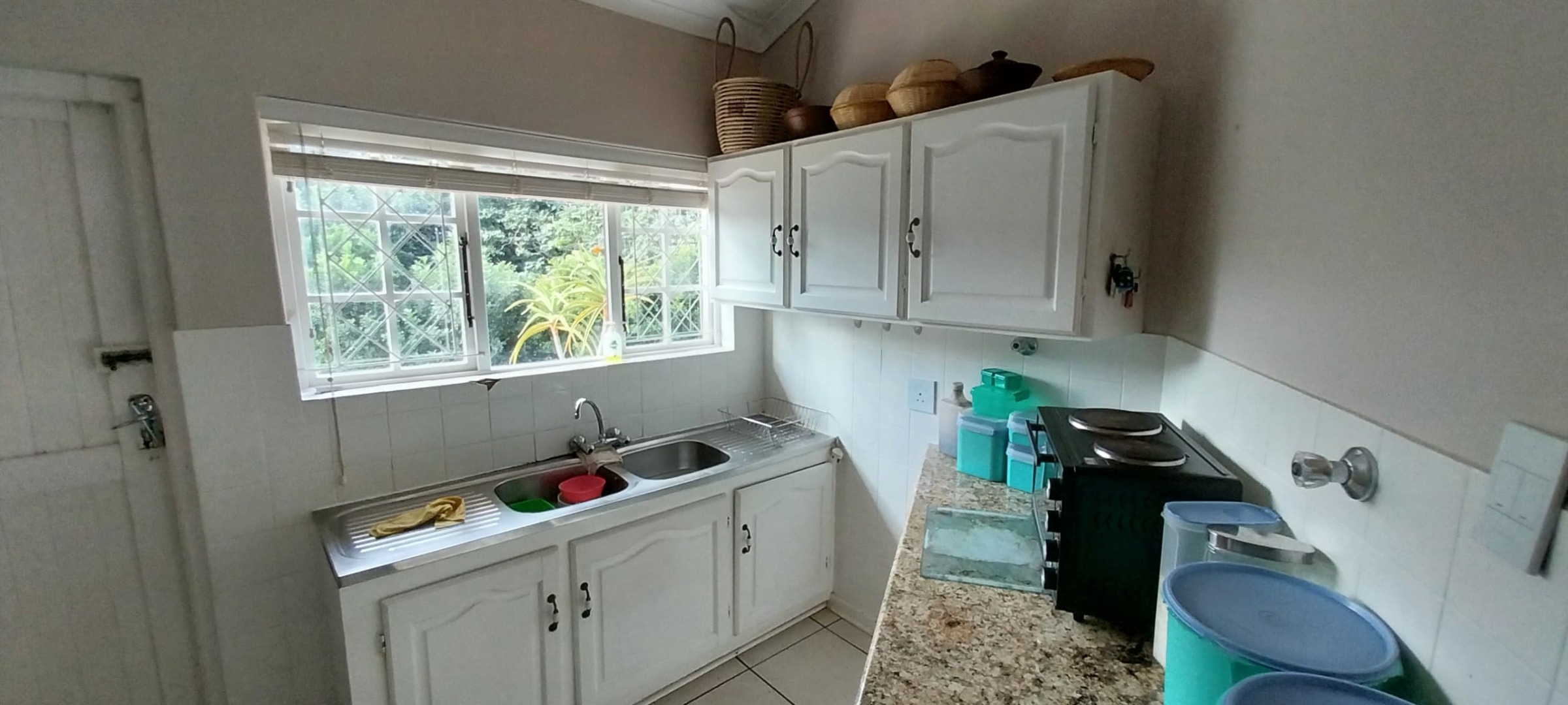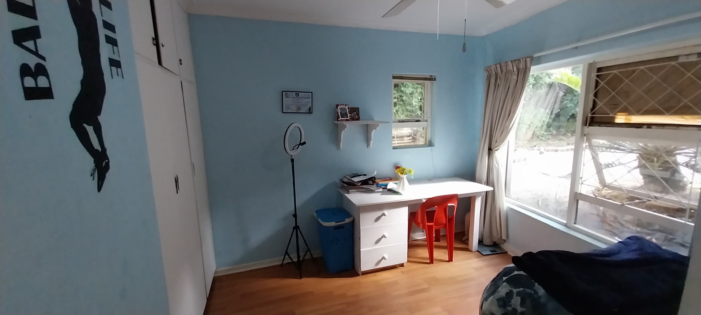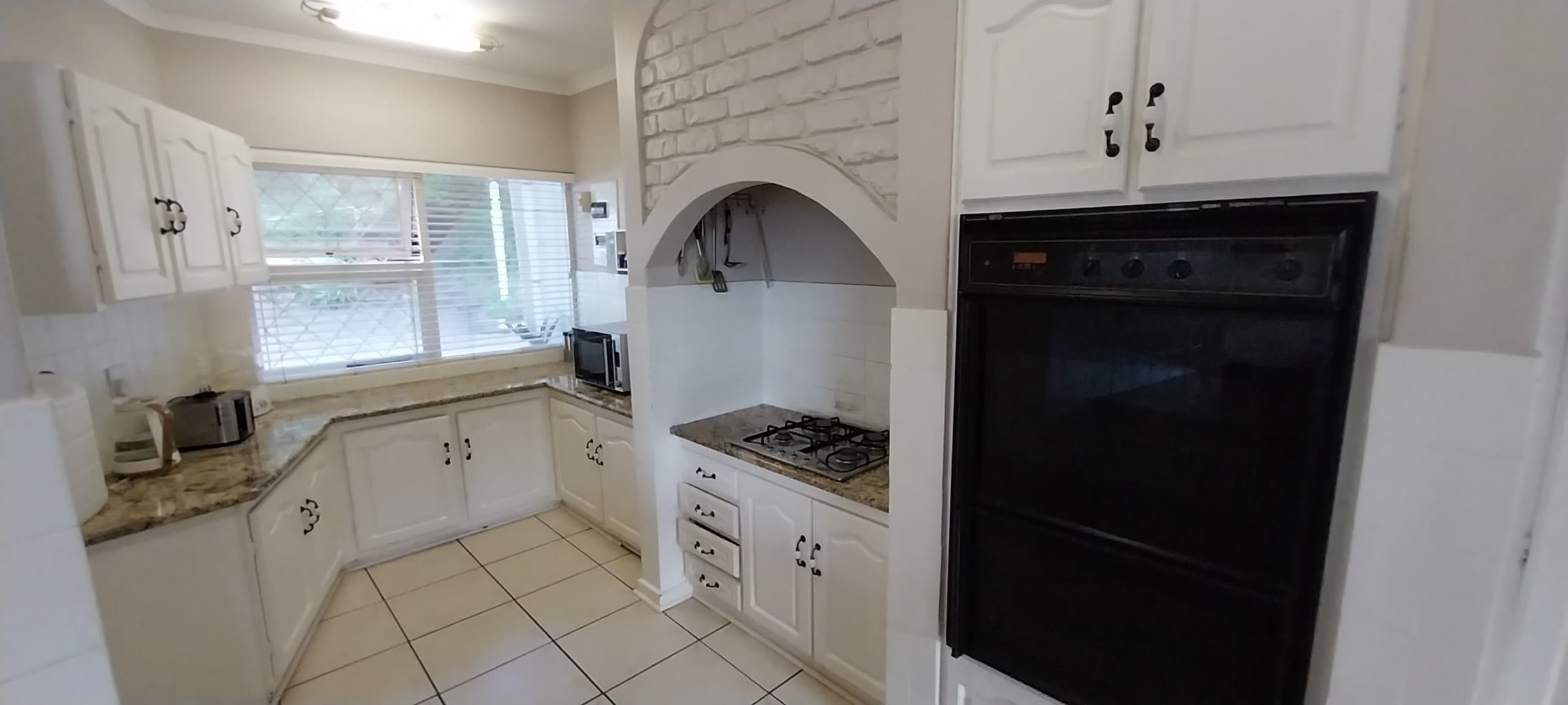 The kitchen is equipped with granite countertops, ample built-in cupboards, a gas stove, two eye-level ovens, space for a double fridge, and a double sink. A dedicated dining area just off the lounge and kitchen makes family meals and dinner parties a breeze.