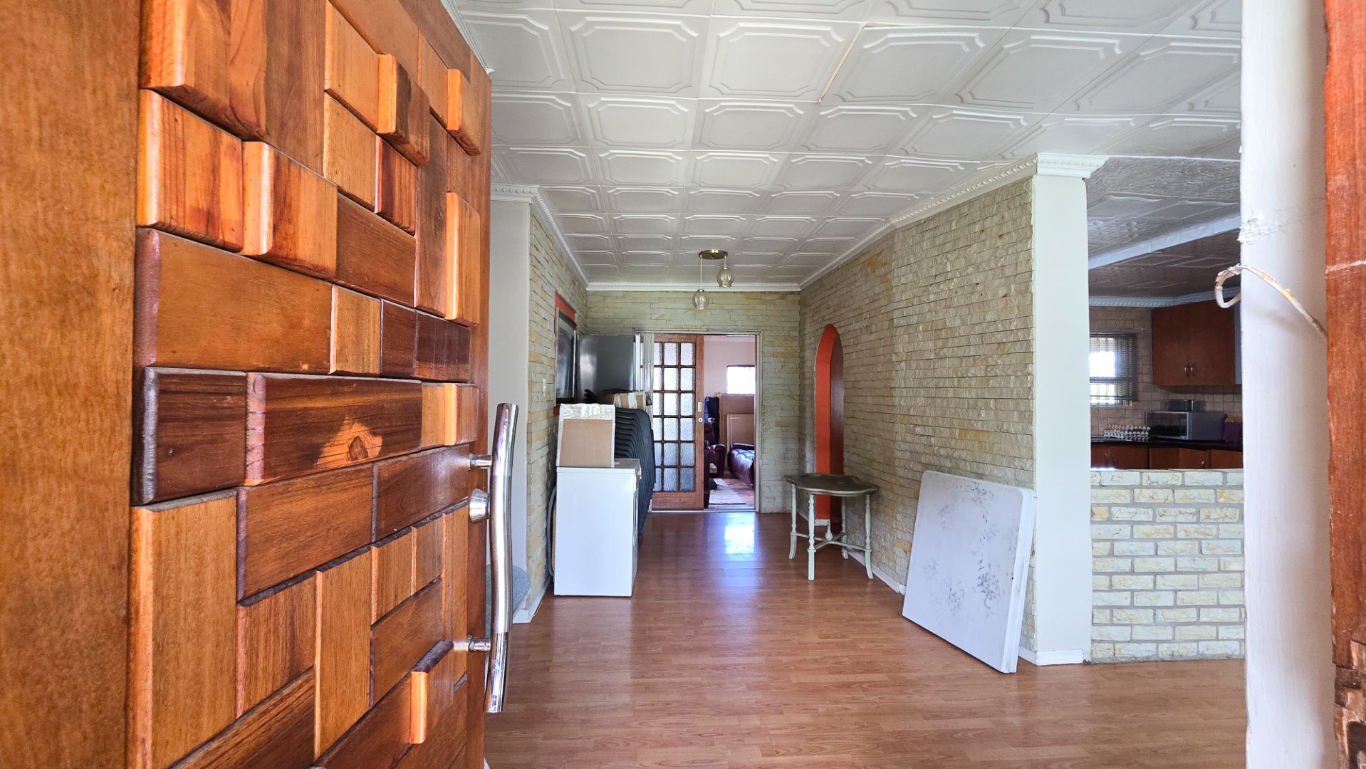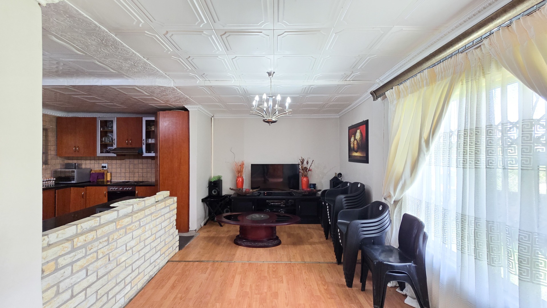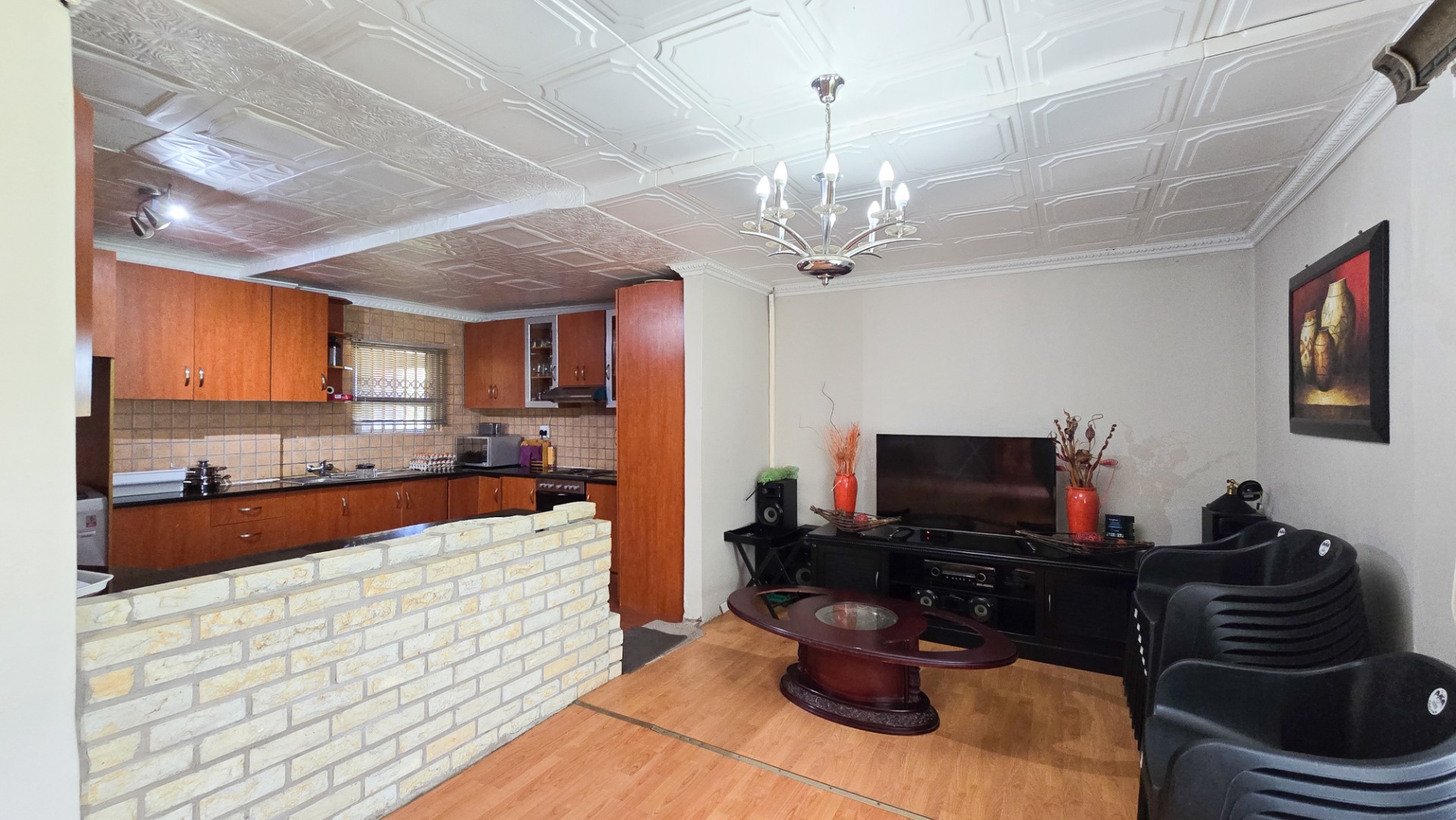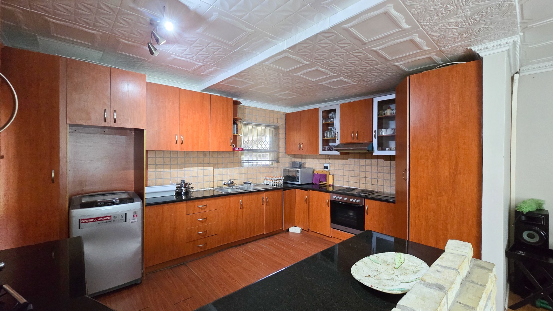 It offers an open plan lounge, dining room and kitchen with fitted built in cupboards and double garage. The house is rightly priced, well secured, situated in a secure environment with a remote control access gate.