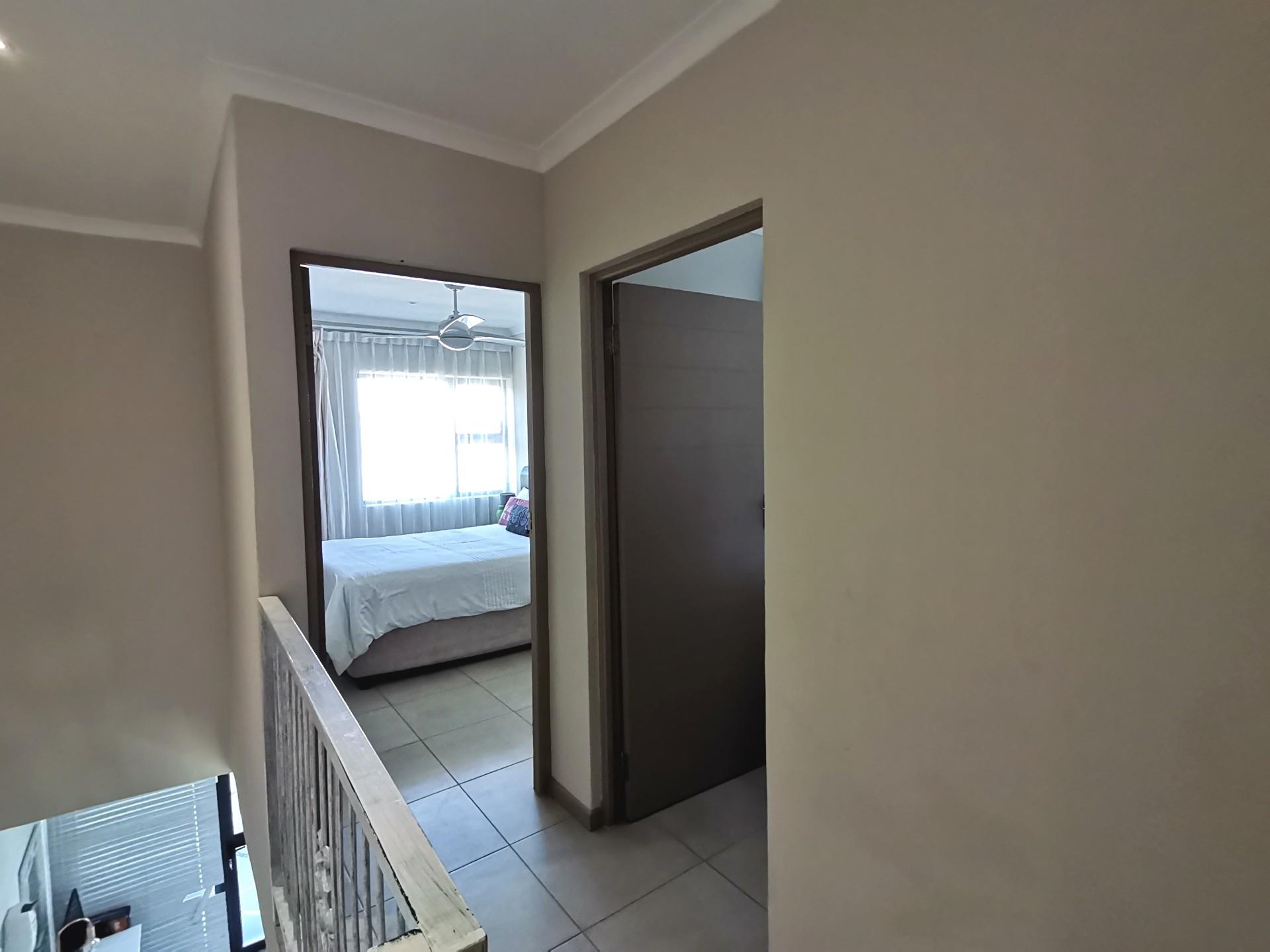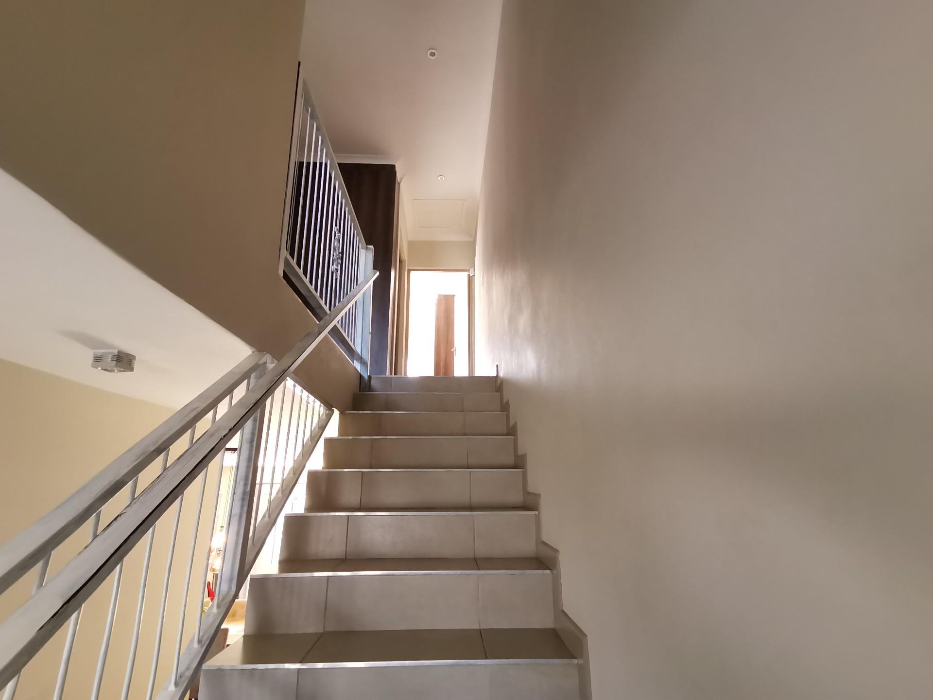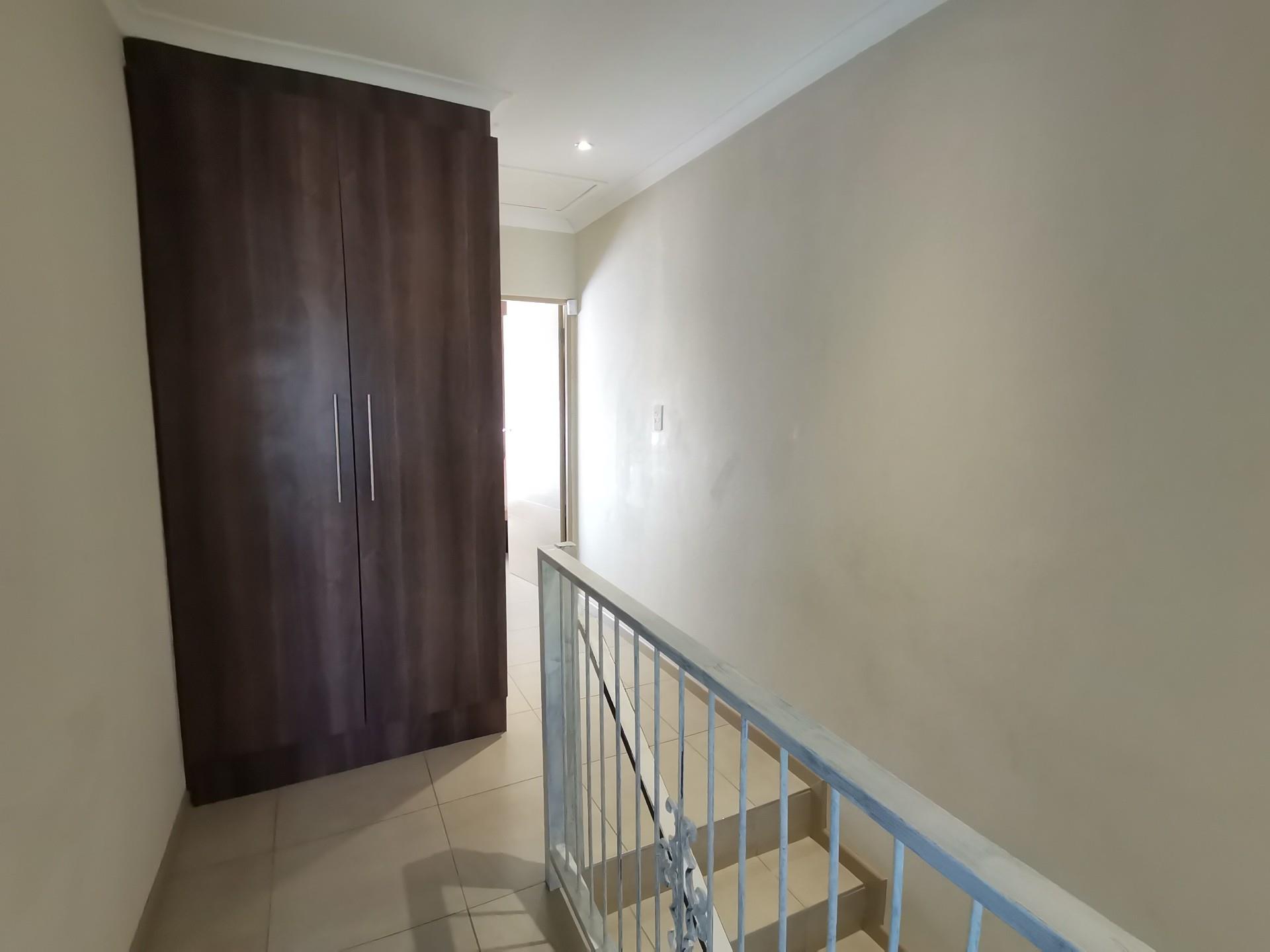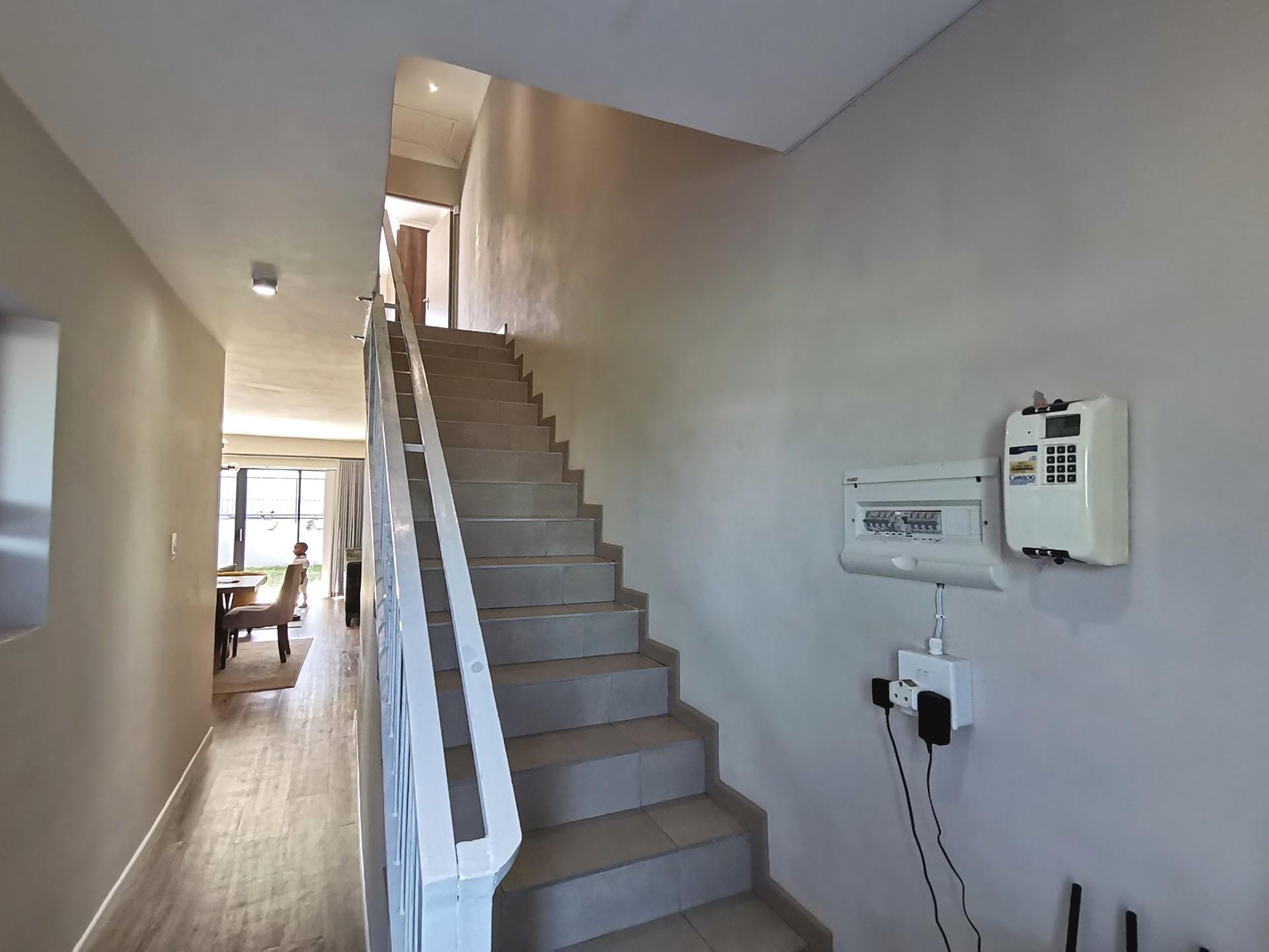 Upstairs consists of 3 bedrooms, all with built in cupboards. The family bathroom has a bath, shower and toilet. The en-suite has a shower toilet and basin. The main bedroom has a private balcony.