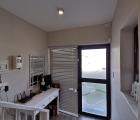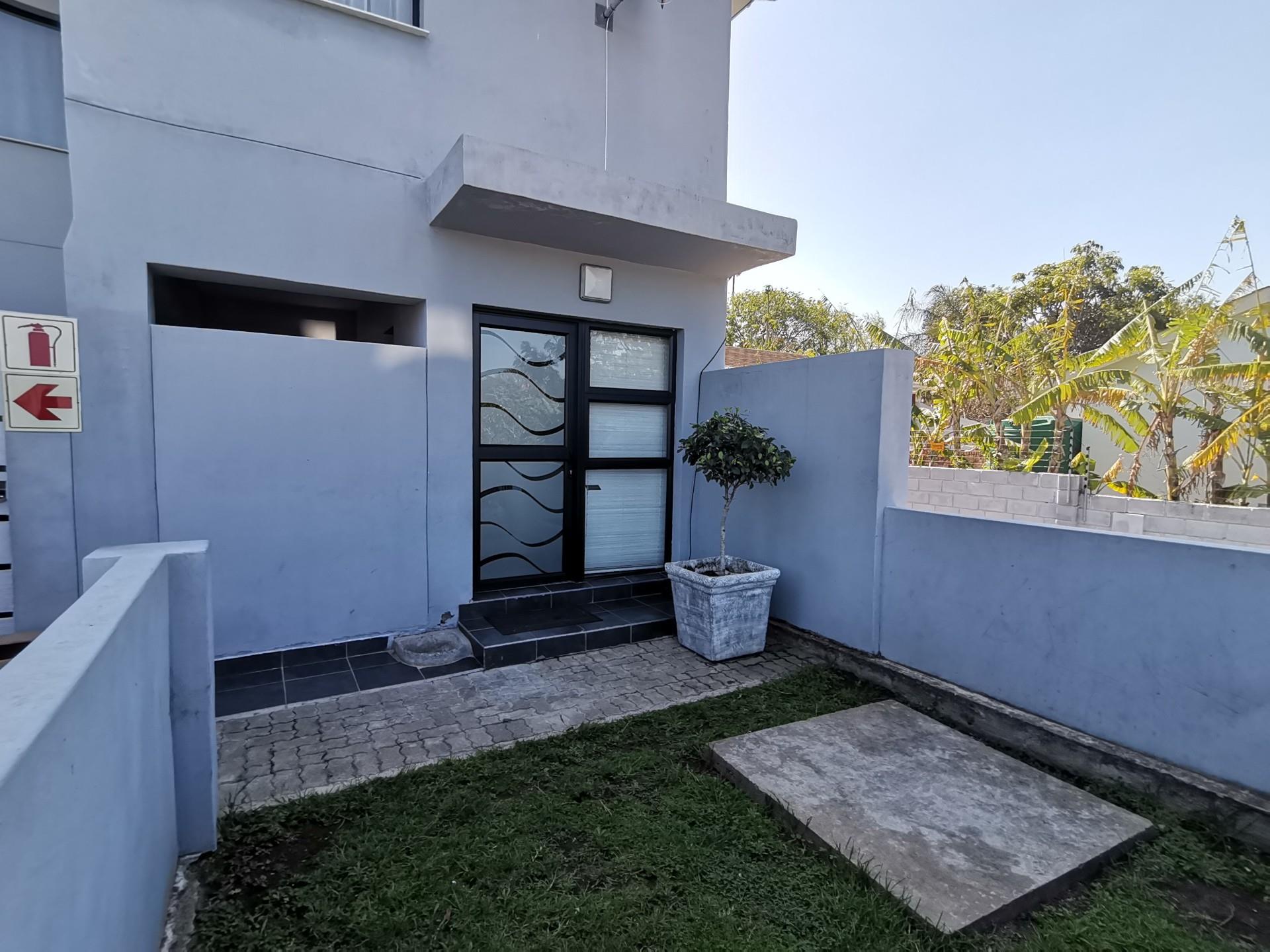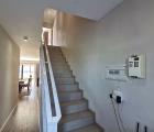 Downstairs has an open plan lounge and kitchen area, which leads onto a patio with a built in braai and a small easy to maintain garden and a guest toilet.