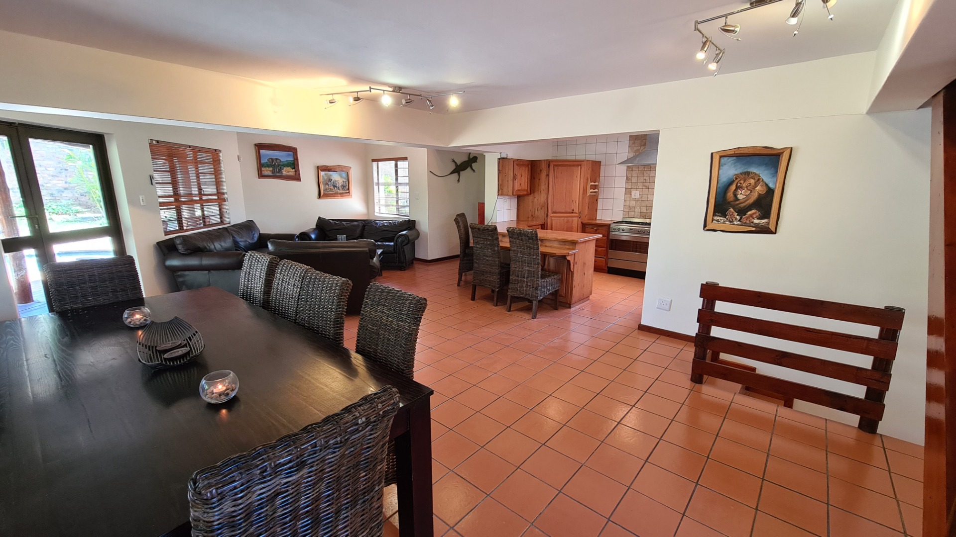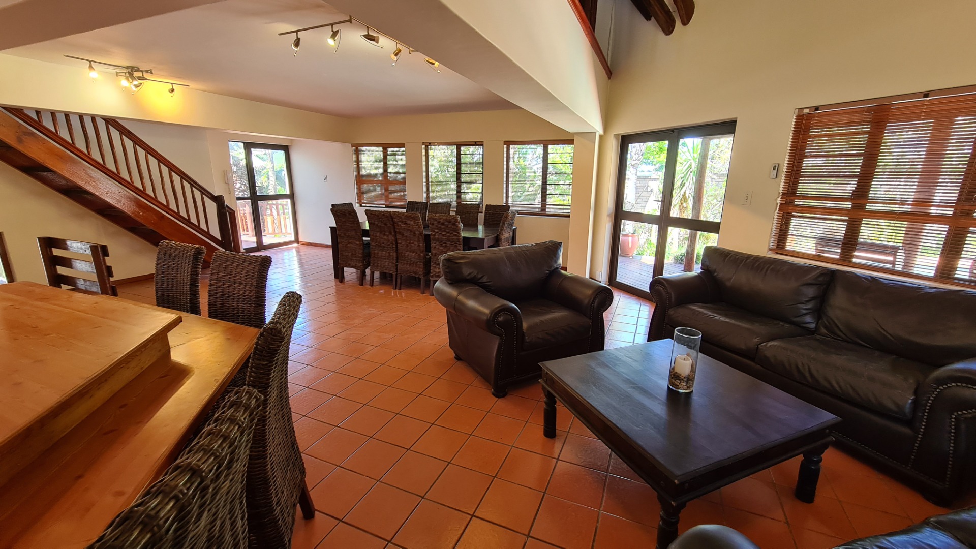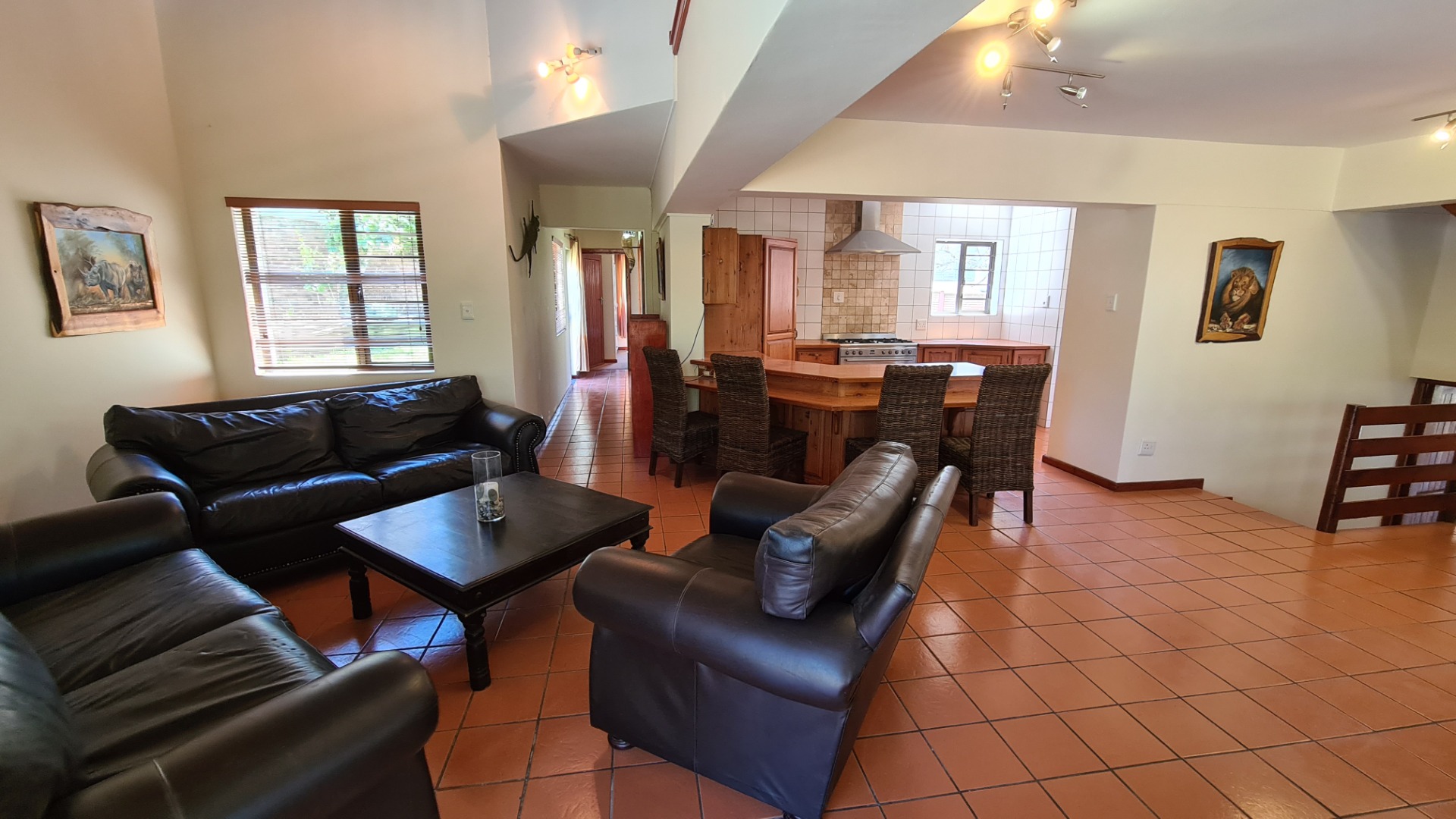 This 6 bedroom home is available to rent. Downstairs consists of an open plan lounge leading out onto an undercover braai area and a sparkling pool, dining area and kitchen. There is a guest toilet, and two bedrooms both with en-suite bathrooms.