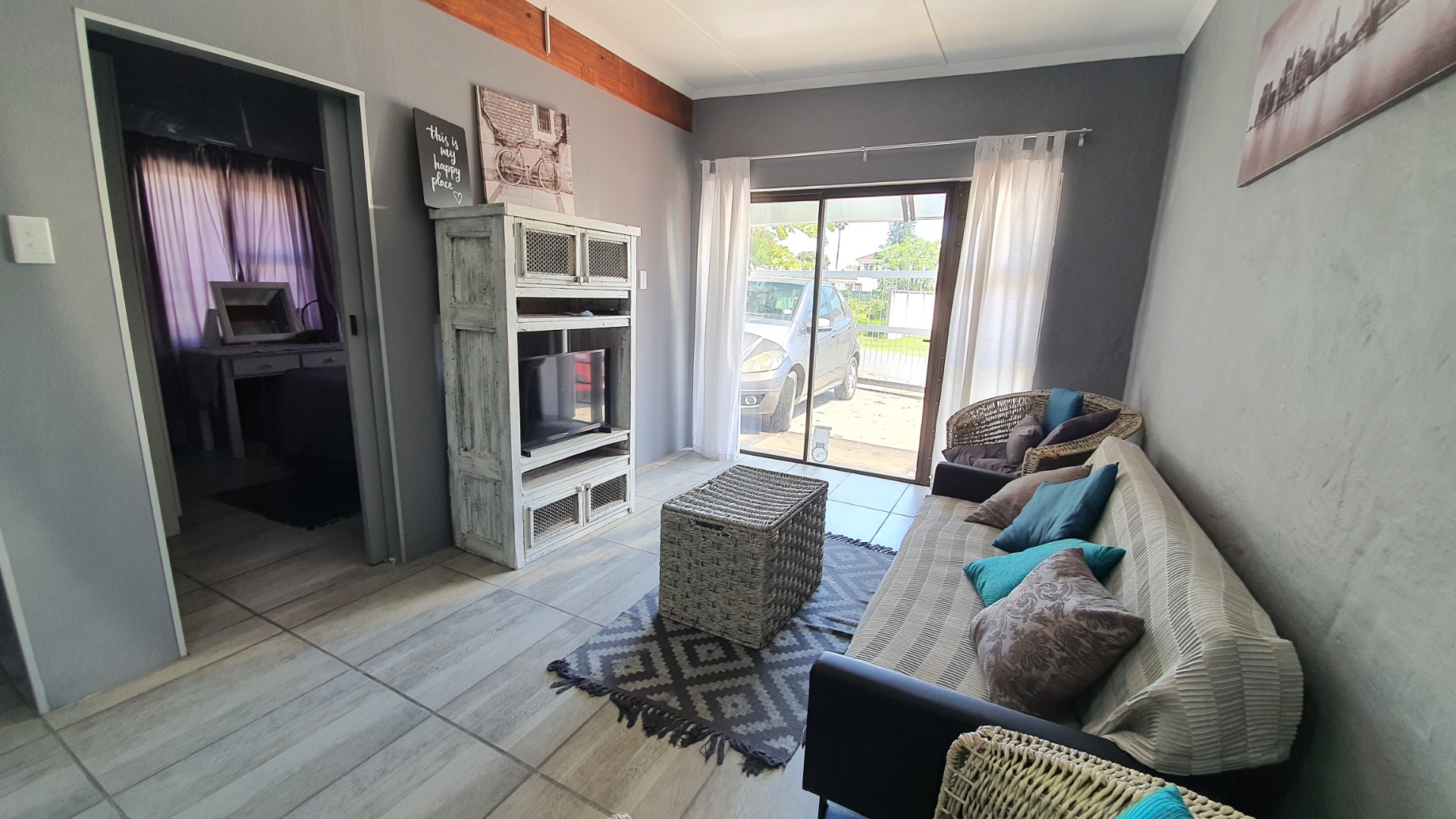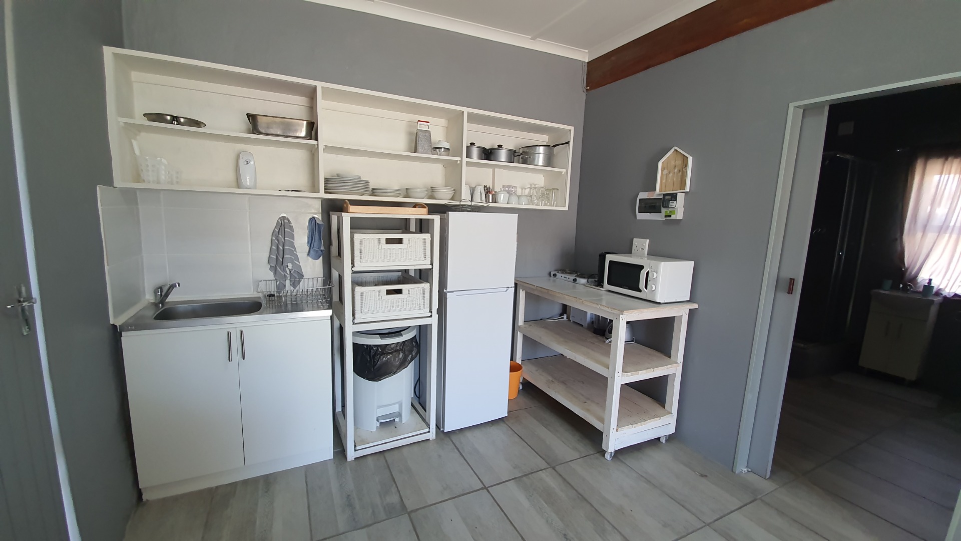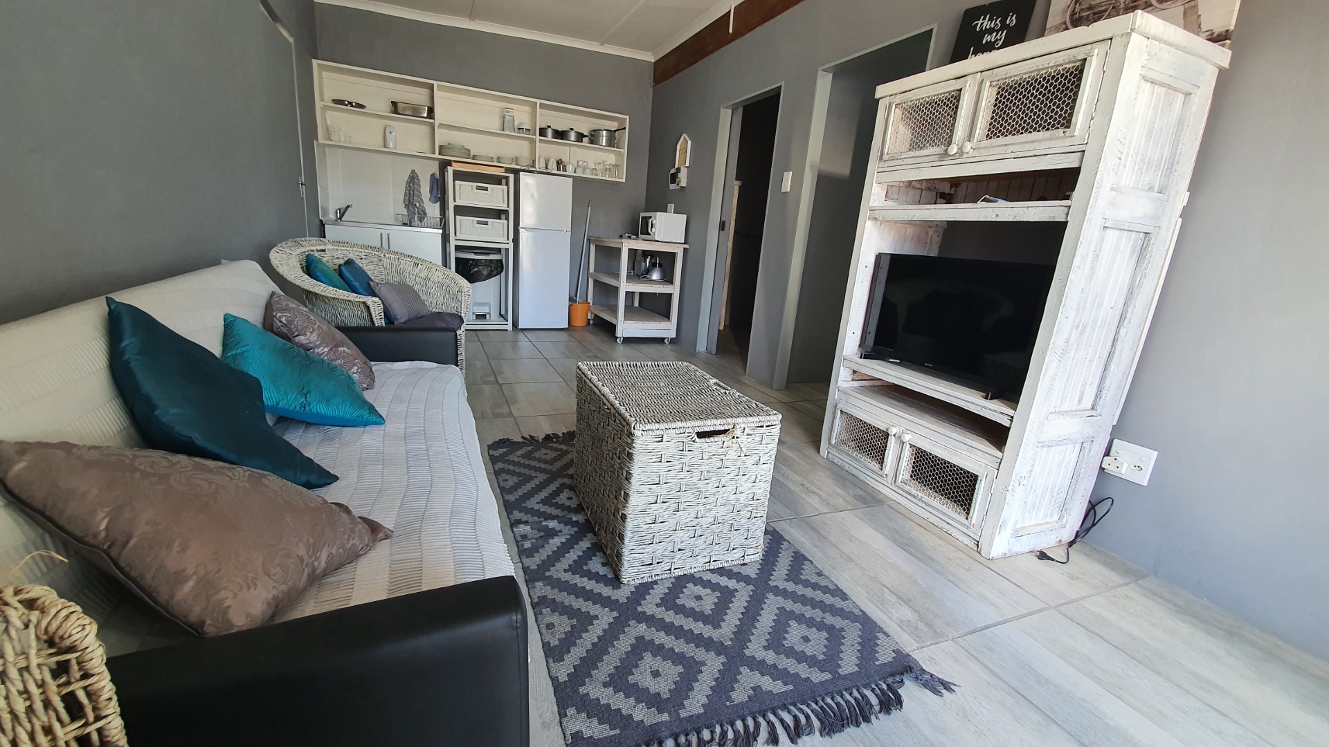 It offers a kitchenette - with regret no stove only a microwave, a bathroom with a shower only and a gas geyser. This one bedroom unit with a lounge is furnished with comfortable furniture.
