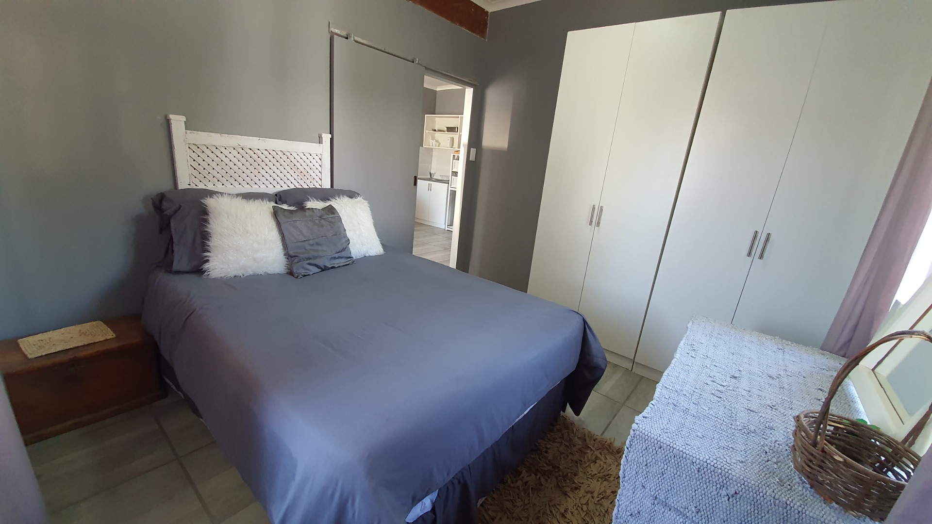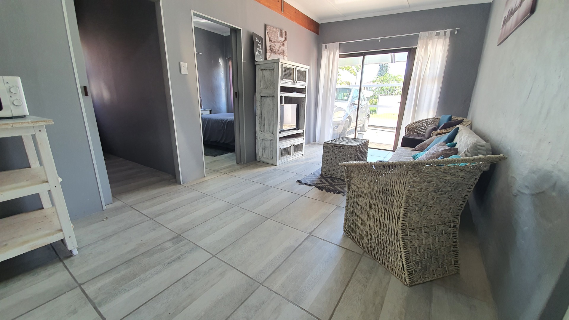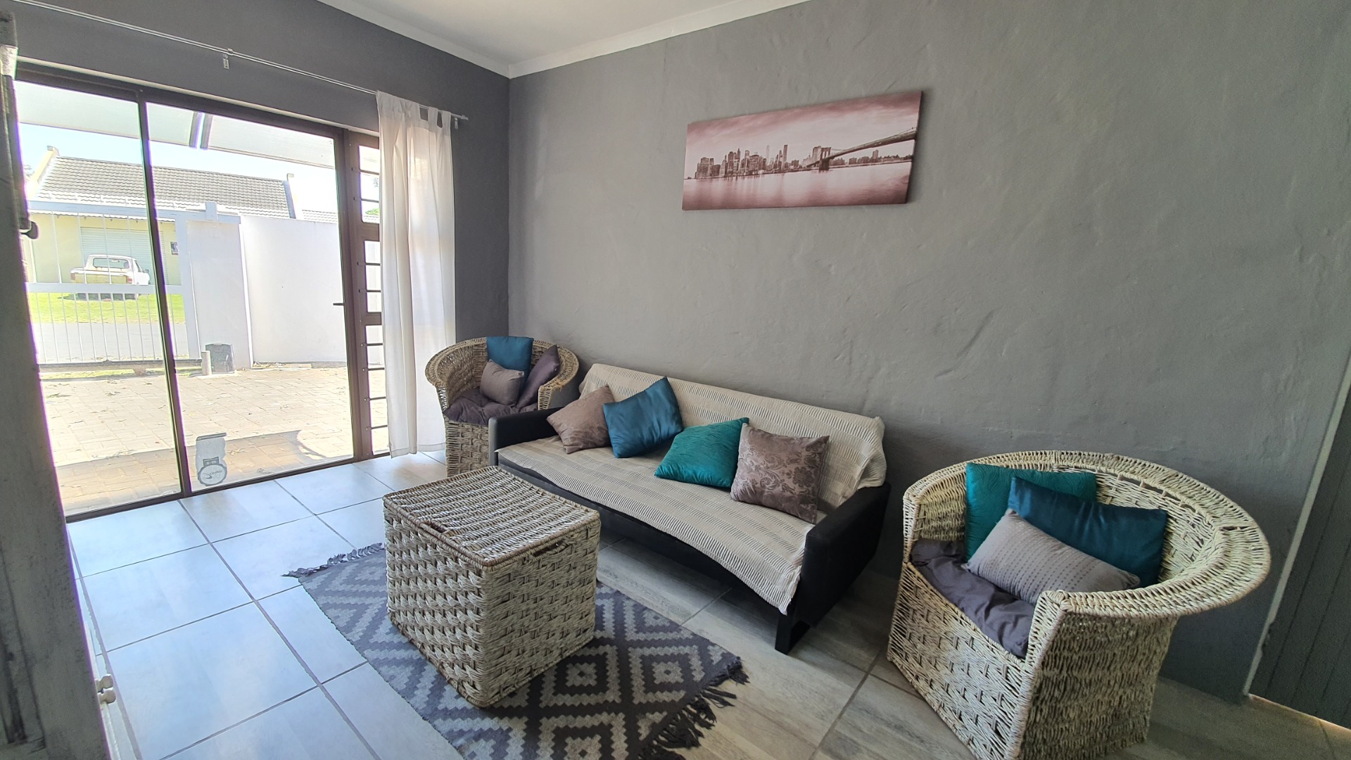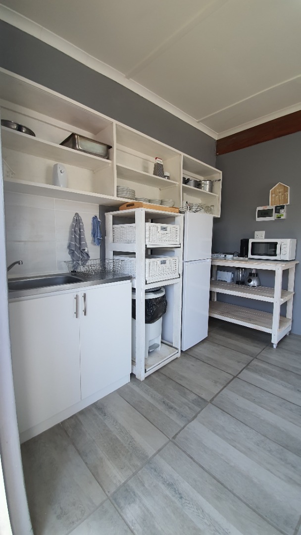 It offers a kitchenette - with regret no stove only a microwave, a bathroom with a shower only and a gas geyser. This one bedroom unit with a lounge is furnished with comfortable furniture.