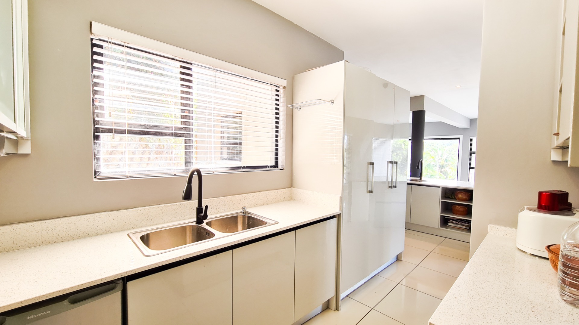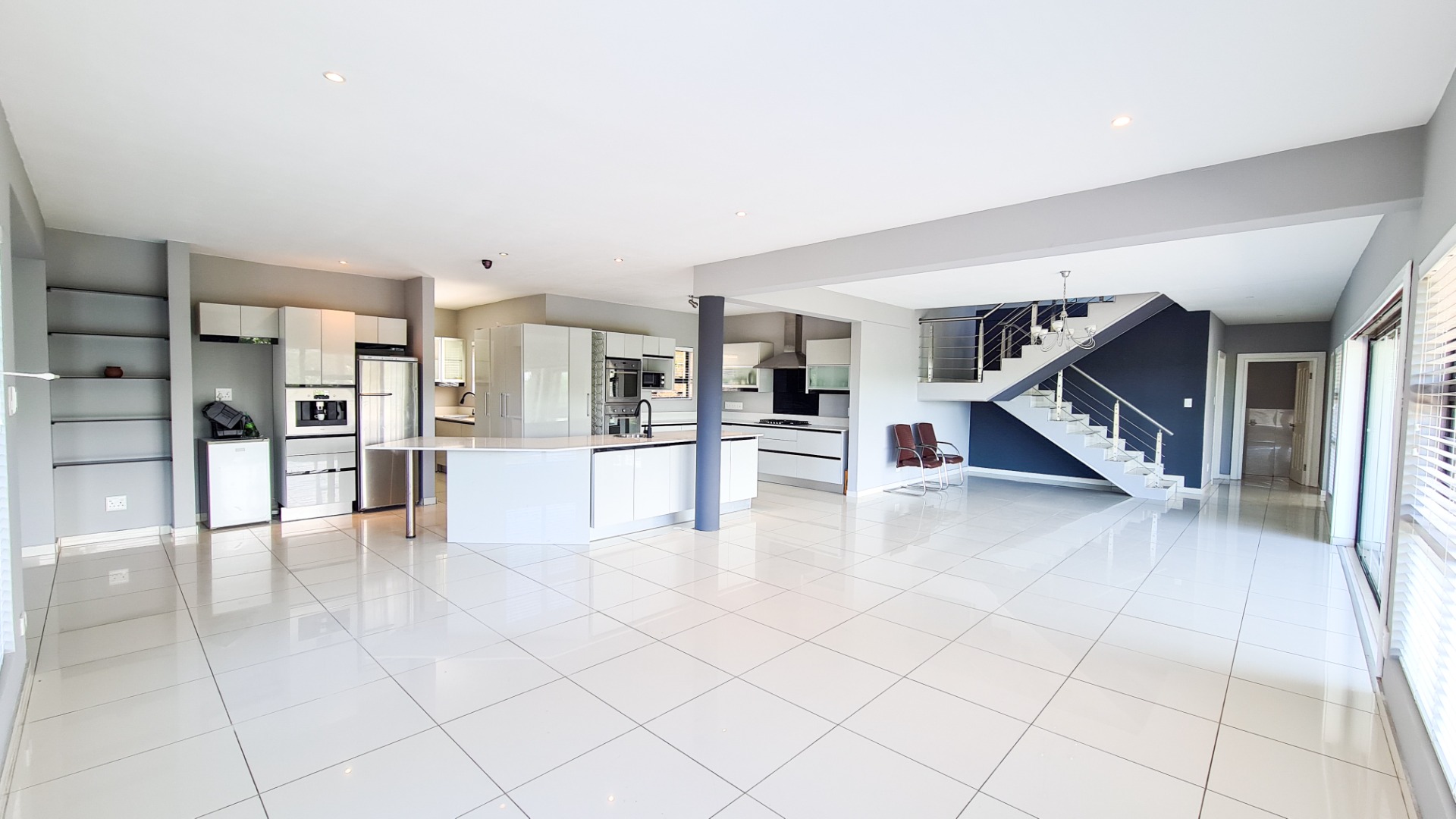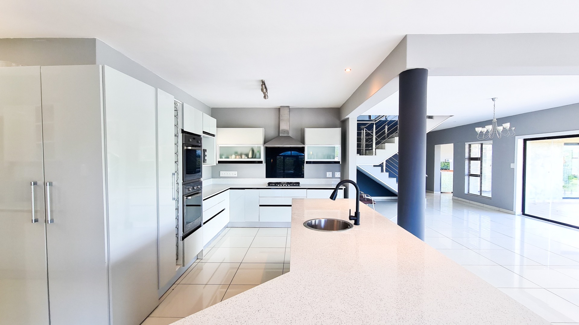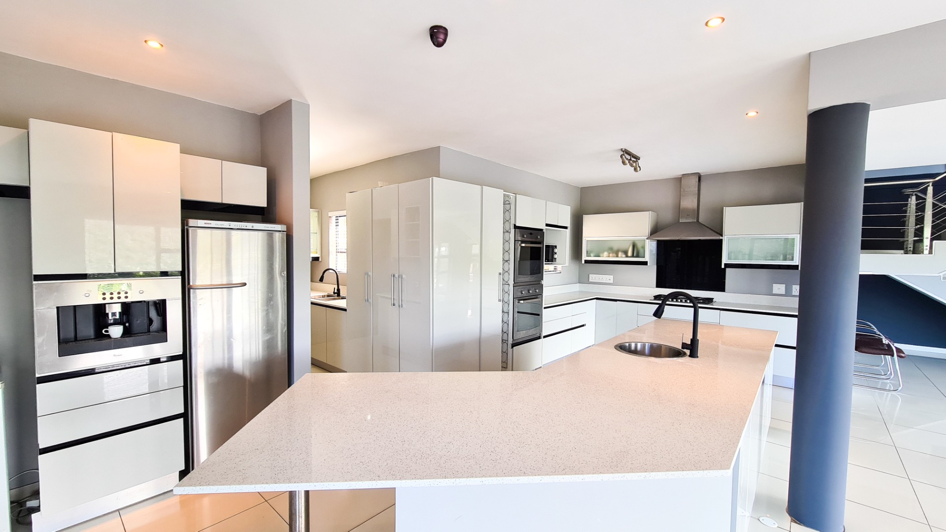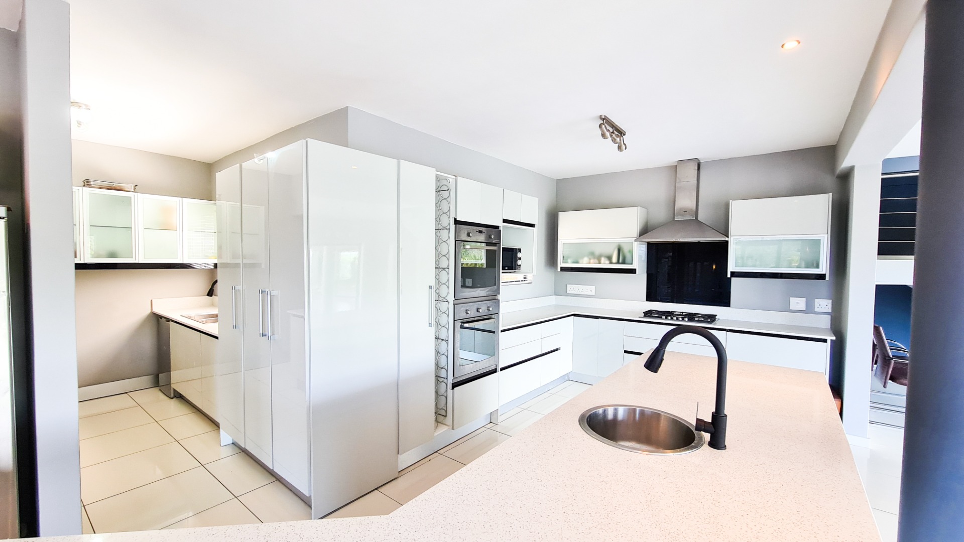 Upon entering the home via a stunning glass entrance, you are transported into a unique, modern world of space and light! The kitchen features imported cupboards with Caesarstone counter tops, Blum fittings and features a separate scullery and laundry.