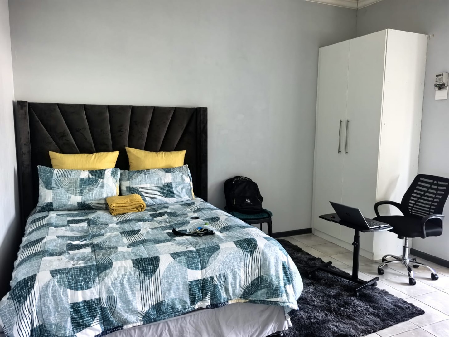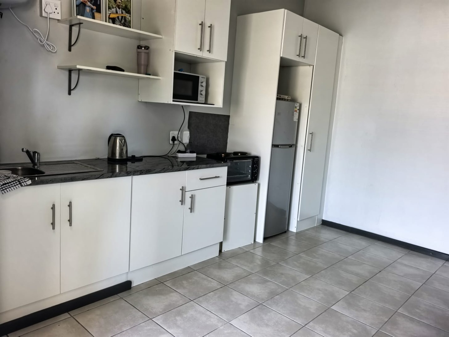 The unit features an open-plan living and sleeping area with a kitchenette, as well as a private bathroom, offering comfortable and practical living in a central location. Electricity is prepaid and there is a fixed charge of R250 per month for water (tenants share)