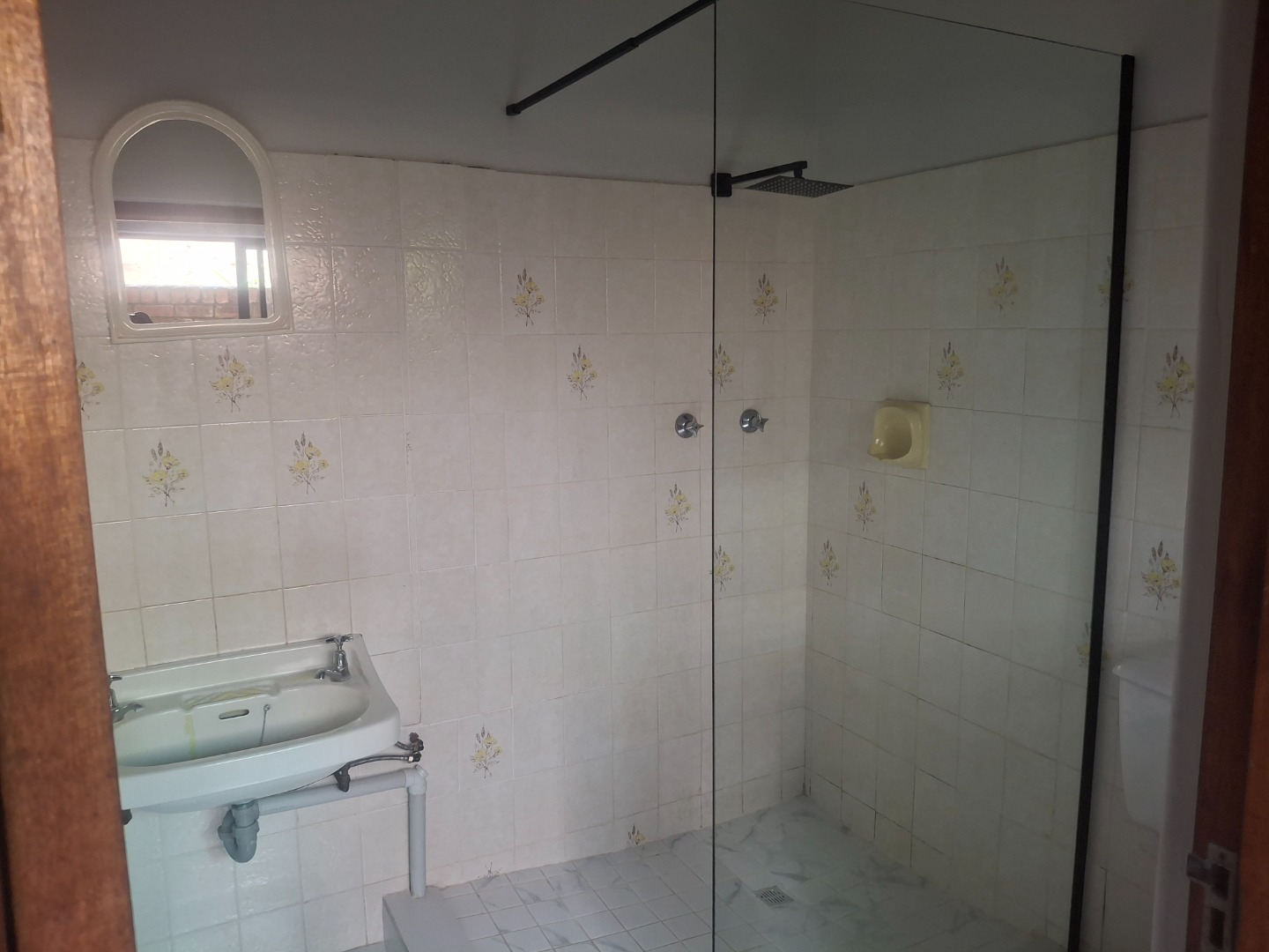 Bathroom shower, basin, toilet.